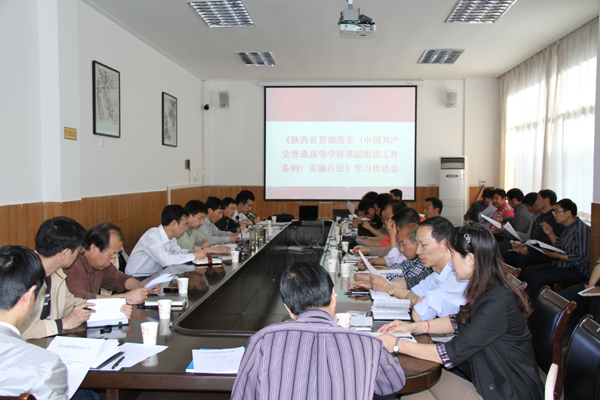 杨涛传达了4月20日在西安召开的第十九次全省高校党建工作会议的精神,并结合学院党建工作和当前正在进行的第一次党代会筹备工作,对《陕西省贯彻落实〈中国共产党普通高等学校基层组织工作条例〉实施办法》重点内容进行了解读。他指出,新修订的《中国共产党普通高等学校基层组织工作条例》和省委出台的贯彻落实《实施办法》,是进一步加强和改进高校党的建设,推动高等教育科学发展的坚强保证。他要求全院各级党组织,要紧密结合高等教育发展新形势和新要求,进一步理清和完善学院“十二五”发展思路和措施,围绕中心工作抓党建。把学习贯彻落实《条例》和《实施办法》与筹备召开学院第一次党代会、严格执行院系党政联席会议制度、组织实施“三位一体”考核、加强干部队伍和领导班子建设等工作结合起来,及时修订完善相关制度和文件,不断提升学院各项工作的规范化、科学化水平,为学院第一次党代会胜利召开,完成各项预定任务提供组织保证。