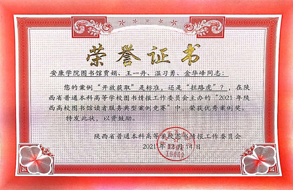 近日,陕西省普通本科高等学校图书情报工作委员会公布了2021年陕西高校图书馆读者服务典型案例优秀奖名单,我校图书馆提交的案例《“开放获取”是标准,还是“拦路虎”?》成功获奖。
