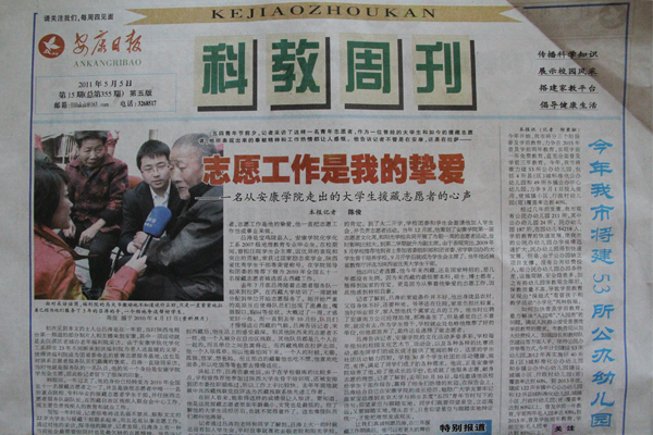 5月5日,《安康日报 科教周刊》头条刊登了该报记者陈俊采写的《志愿工作是我的挚爱——一名从安康学院走出的大学生援藏志愿者的心声》,文章介绍了我院2010届化学化工系毕业生、援藏志愿者吕涛的先进事迹。全文如下: