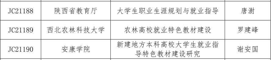 近日,教育部全国高等学校学生信息咨询与就业指导中心公布了“2021年全国高校就业创业特色教材课题立项名单”,由我校谢安国教授主持申报的《新建地方本科高校大学生就业指导特色教材建设研究》获得立项资助。此次我省共有陕西省教育厅、西北农林科技大学、安康学院等5家单位申报项目获批立项,教材将作为“全国高校就业创业特色教材课题研究成果”,由教育部全国高等学校学生信息咨询与就业指导中心统一组织出版。