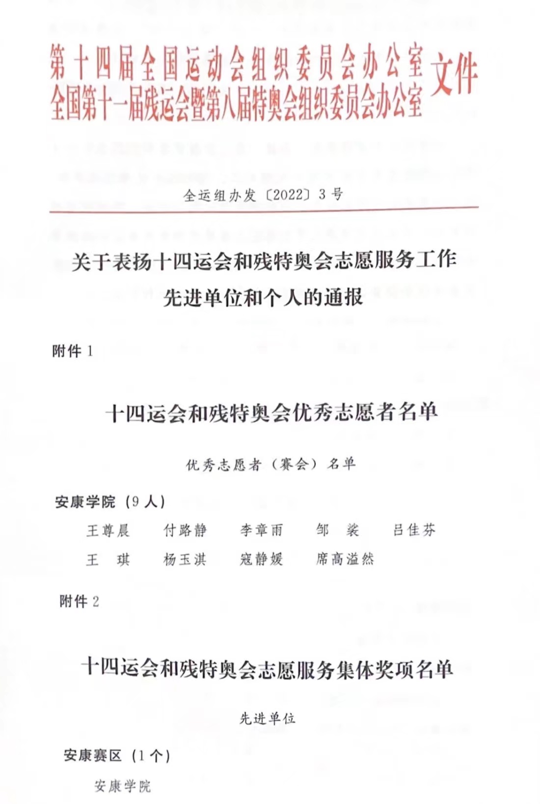 近日,第十四届全国运动会组织委员会办公室、全国第十一届残运会暨第八届特奥会组织委员会办公室联合发布了《关于表扬十四运会和残特奥会志愿服务工作先进单位和个人的通报》,安康学院获十四运会和残特奥会志愿服务先进单位荣誉称号,付路静等9名师生获十四运会和残特奥会优秀志愿者荣誉称号。