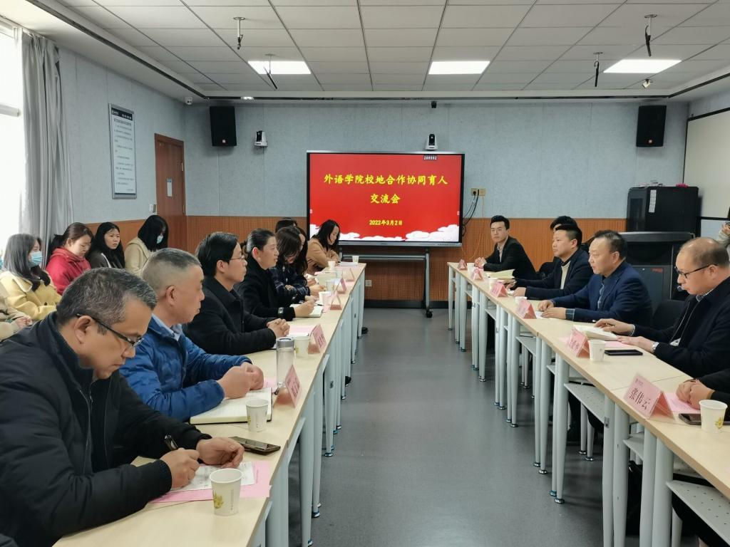 3月2日下午,外语学院校地合作协同育人交流会在江南校区师范生技能训练中心召开。安康市商务局二级调研员陈涛、二级主任科员徐先海,鑫卓青科技有限公司经理赵敏,陕西省安贝斯玩具科创有限公司董事长沈爱华,外语学领导班子、两办主任、辅导员、商务英语系教师及学生代表出席了会议。会议由外语学院总支书记肖红香主持。