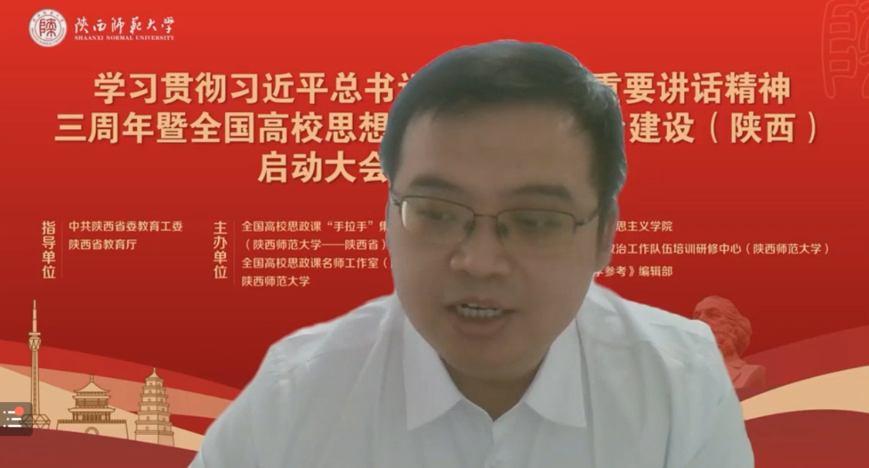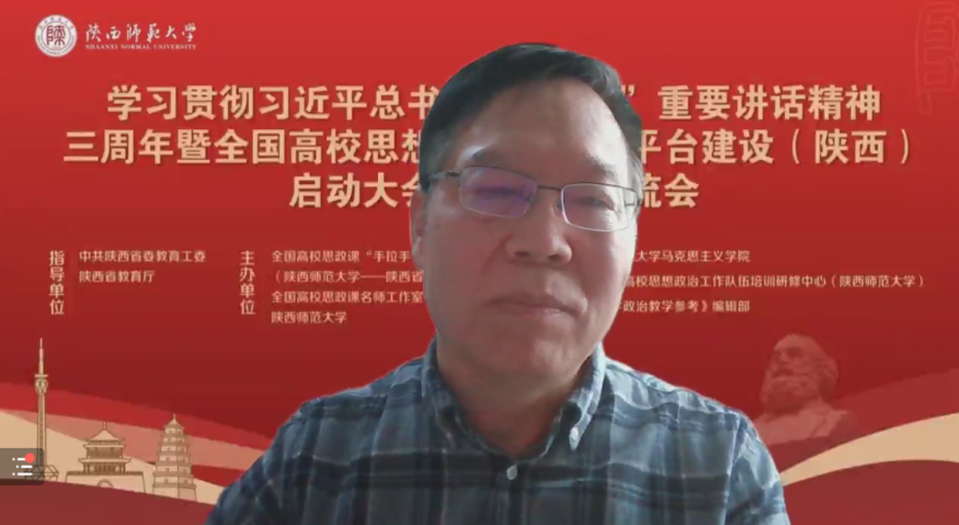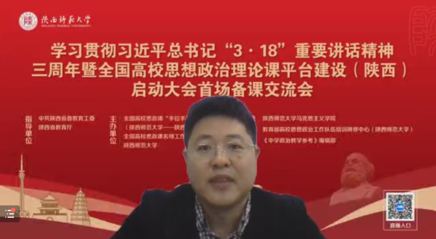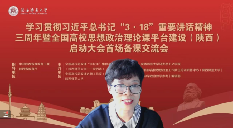 本次教学沙龙活动依托全国高校思政课“手拉手”集体备课中心(陕西师范大学——陕西省)首场线上备课交流会进行。全体思政教师在线聆听了复旦大学马克思主义学院教授、国家教学名师,教育部高等学校教学指导委员会(马克思主义理论类)委员,教育部高等学校思想政治理论课总教指委副主任委员高国希教授;西安交通大学马克思主义学院院长燕连福教授;西北大学马克思主义学院常务副院长王强教授;陕西师范大学马克思主义学院副院长张帆教授;陕西省教育科学研究院基础教育研究中心副主任夏波老师的主旨报告和思政课改革创新经验分享。在线观摩了第二届全国高校思政课教学展示特等奖获得者西安工程大学郭松副教授和西安高新一中正高级教师李育民的教学展示。随后,我校思政课教师在线交流了学习观摩心得。