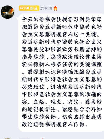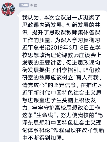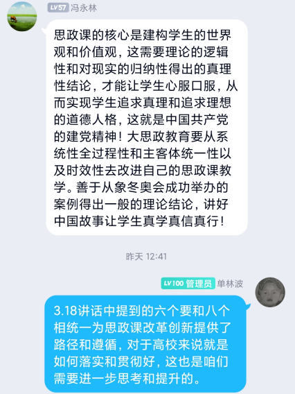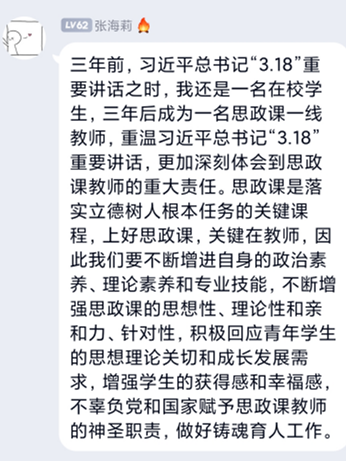 为深入学习贯彻习近平总书记在全国学校思想政治理论课教师座谈会上的重要讲话精神,3月19日,马克思主义学院举行学习贯彻习近平总书记“3·18”重要讲话精神三周年暨线上教学沙龙活动。我校全体思政课教师参加此次活动。
