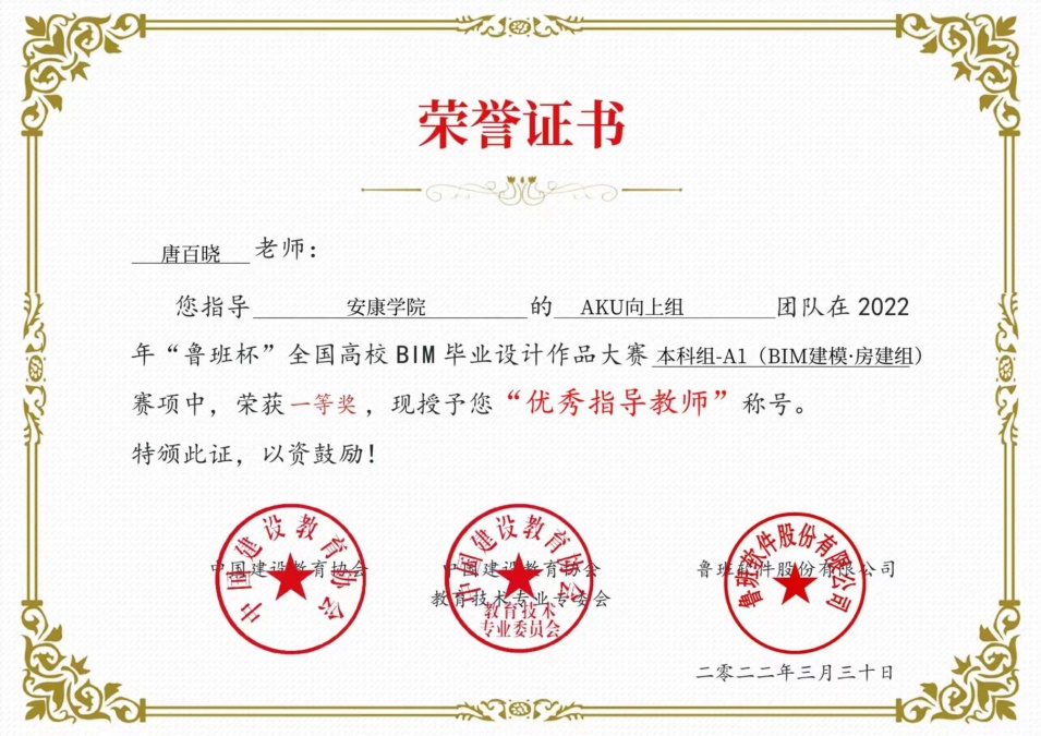 该项赛事由中国建设教育协会主办,中国建设教育协会教育技术专业委员会、浙江同济职业技术学院和上海鲁班软件股份有限公司共同承办,历时近5个月。比赛共分为赛项A(BIM建模)和赛项B(BIM应用)两个组别,本科组共有近300支团队1400余名师生参加比赛。我校经管学院教师唐百晓导学生团队“aku向上组”经过初赛、决赛、线上答辩和专家评审等环节在赛项A(BIM建模)赛项中获得全国一等奖,指导教师获得“优秀指导老师”称号。