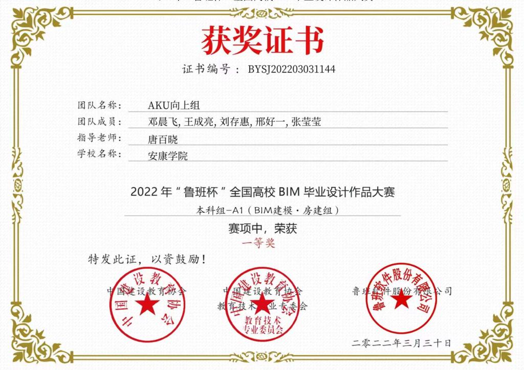 近日,2022年“鲁班杯”全国高校BIM毕业设计作品大赛A赛项落下帷幕。在本次比赛中,我校经管学院BIM社团学生邓晨飞、王成亮、刘存惠、邢好一和张莹莹组成的团队在A赛项(BIM建模)中荣获全国一等奖。