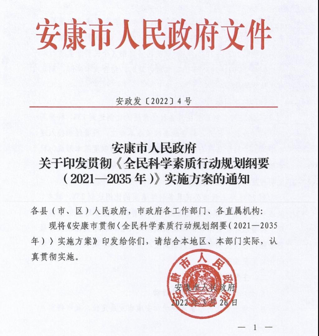 近日,安康市人民政府印发了《关于贯彻<全民科学素质行动纲要(2021-2035年)>实施方案的通知》(安政发[2022]4号),我校教育学院院长王刚教授与团队成员,发挥专业优势,主动对接地方需求,在省、市科协的大力支持下,以横向项目为抓手,积极参与方案的研制与起草工作,横向项目顺利结题,提交的方案经市相关部门广泛征求意见、论证和完善,最终发布。