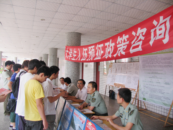 为认真贯彻落实2011年全省高校毕业生预征工作会议精神,帮助广大毕业生了解、掌握应征入伍的相关政策,5月19日下午,我院2011年毕业生入伍预征政策现场咨询会在东校区一号教学楼大厅举行,安康军分区征兵办、汉滨区武装部以及学院学生就业处相关同志参加了现场咨询会。