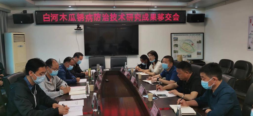 我校“双百工程”帮扶白河县的“木瓜锈病发病特点和防治技术指导”研究项目,在白河县林业局、木瓜产业办公室及白河诚康木瓜种植农民专业合作社的大力支持下,由我校农生学院教师王中兴团队研究完成。为尽快提供利用、检验效能,近日在白河县林业局举行了成果资料移交座谈会。白河县林业局、木瓜产业办公室、教体局领导和林技人员及我校帮扶工作队、科技处、研究团队负责人参加了座谈会。