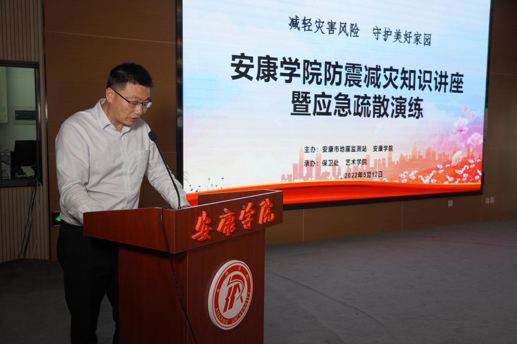 在全国第十四个防灾减灾日来临之际,为进一步增强师生防灾减灾意识,提高师生防灾减灾能力,近日,由安康学院、安康市地震监测站主办的防震减灾知识讲座暨应急疏散演练活动在江北校区图书馆报告厅举行。我校副校长张东红出席活动并致辞,陕西省地震台副台长方炜、安康市城市住建局副局长张英杰、安康市地震监测站副站长张瑞受邀出席,保卫处及各二级学院千余名师生代表通过线上与线下方式参加了此次活动。