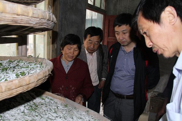 在五里镇刘营村桑树新品种示范基地,杨涛、向纪明与当地的种植大户刘宝珍、养殖大户刘宝佳和村委会主任余登发等亲切交谈,征询对我院蚕桑科技服务的意见和建议及农户在生产中存在的问题与困难。村委会主任余登发代表种养大户对我院在蚕桑科技服务方面给予的帮助表示由衷的感谢,对新品种在生产中表现出的优势及带来的经济效益赞不绝口,并表示希望能长期得到我院蚕桑专家技术指导,把刘营村建成安康学院的桑树新品种和彩色茧示范基地。