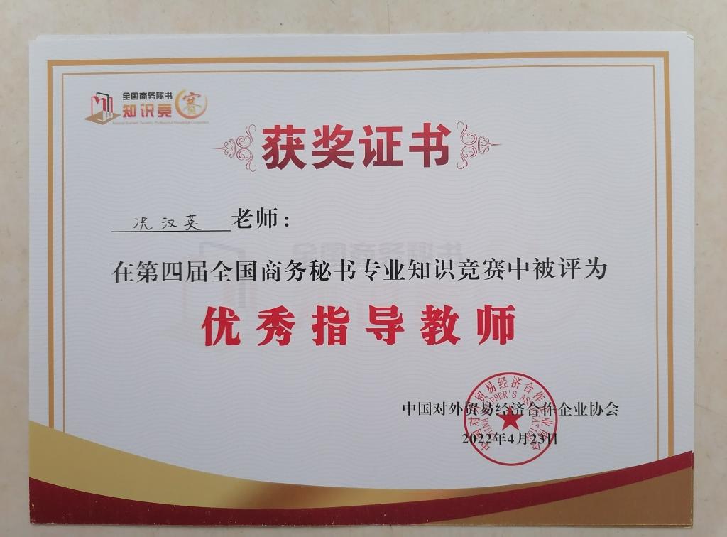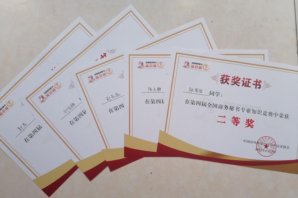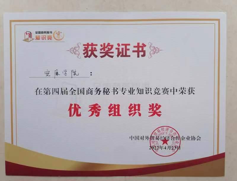 近日,中国对外贸易经济合作企业协会公布了第四届全国商务秘书专业知识竞赛获奖名单,我校文传学院秘书学专业学生再创佳绩。郭杨荣获一等奖,张雪怡等5名学生荣获二等奖,佘海茹等17名学生荣获三等奖,耿世杰等11名同学通过资格认定获“高级商务秘书证书,安康学院获竞赛“优秀组织奖”,文传学院教师况汉英获“优秀指导教师”称号。