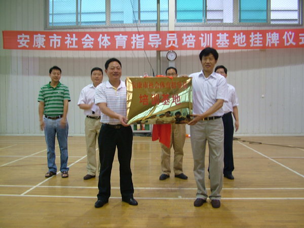 陈元安局长和体育系副主任许宝林为“安康市社会体育指导员培训基地”揭牌。