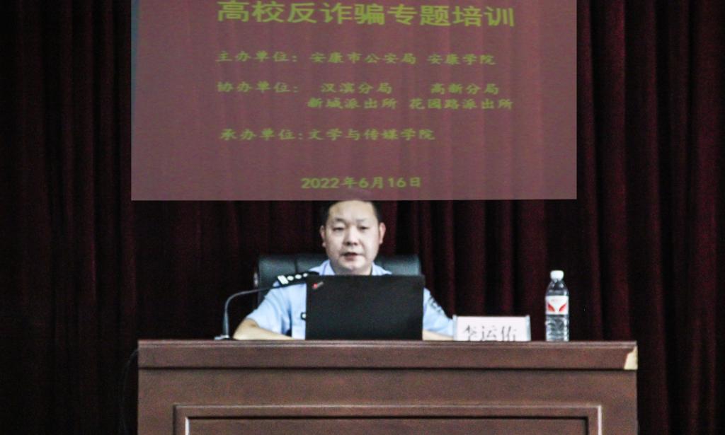 6月16日下午,安康学院联合安康市公安局在江南校区大礼堂开展高校反电信诈骗专题教育培训活动。本次活动采用线上线下相结合形式进行,由我校保卫处主办,文传学院承办。全国刑事信息研判专家、安康市反诈中心主任李运佑、警员康洋,我校所属辖区安康市汉滨区新城派出所、高新区花园路派出所民警,安康学院保卫处全体成员、学工部、各二级学院师生代表加了此次活动。