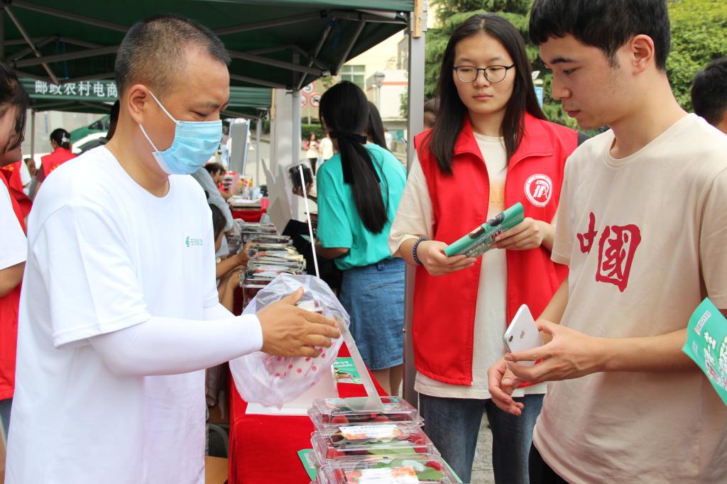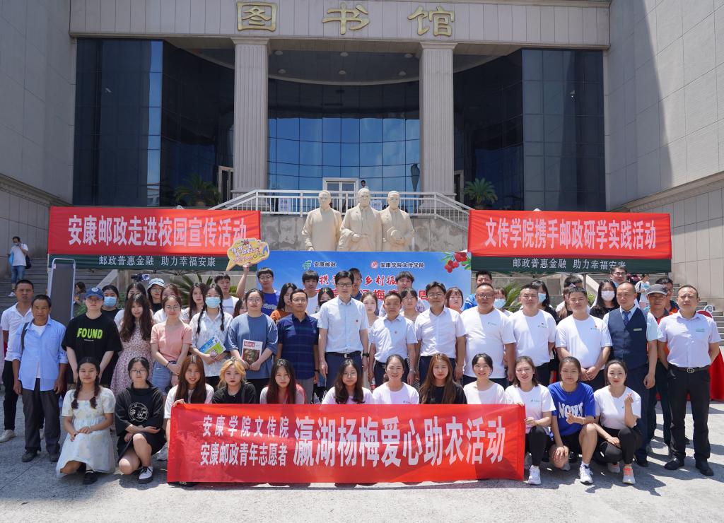 6月17日-19日,正值“电商节”,文传学院与安康邮政再次深度合作,开展瀛湖杨梅爱心助农活动。中国邮政集团有限公司安康市分公司江南分公司总经理王永星、副总经理刘琰,文传学院党政领导以及网媒专业的教师们在活动现场,共同参与爱心助农活动。文传学院的“助农小分队”与安康邮政公司在江南校区图书馆门前和江北校区食堂前先后设立了爱心杨梅义卖活动点,让农户亲自带着自家产的杨梅走进大学校园,一边线上直播互动,一边线下优惠销售。在三天的线下销售中,1000余斤新鲜的杨梅全部售罄。农户激动地说:“要不是安康邮政和安康学院帮助我这个农民,这些杨梅都要烂在园子里了。”