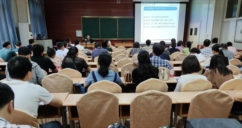 席成孝教授以《紧扣认证标准,重塑培养体系,提高培养质量》为题,分别从明确“认证”与“OBE”理念、把握认证标准立意、理解认证标准实质、掌握认证标准关键、构建产出导向培养体系科学实施三项机制、学校学院及教师需做的重点工作等方面详细阐述了如何推进专业认证工作,并以案例方式详细分析了专业人才培养方案和课程教学大纲修订中应注意的问题,深入阐释了“培养目标”“毕业要求”“课程目标”的相互支撑关系,深刻解读了认证工作的标准和要求。