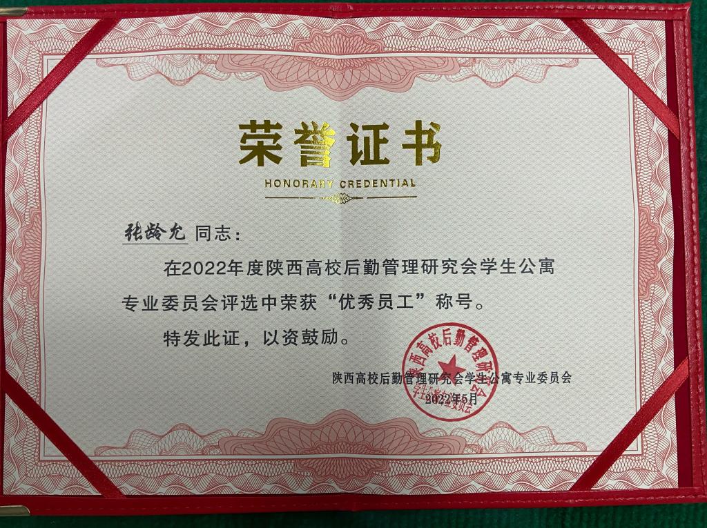近日,陕西省高校公寓专业委员会对2021年陕西省各高校在学生公寓管理方面成绩突出、表现优秀的团体和个人进行了表彰。我校学工部荣获“先进集体”荣誉称号,学生公寓管理科科长张龄允荣获“陕西高校学生公寓优秀员工”荣誉称号。