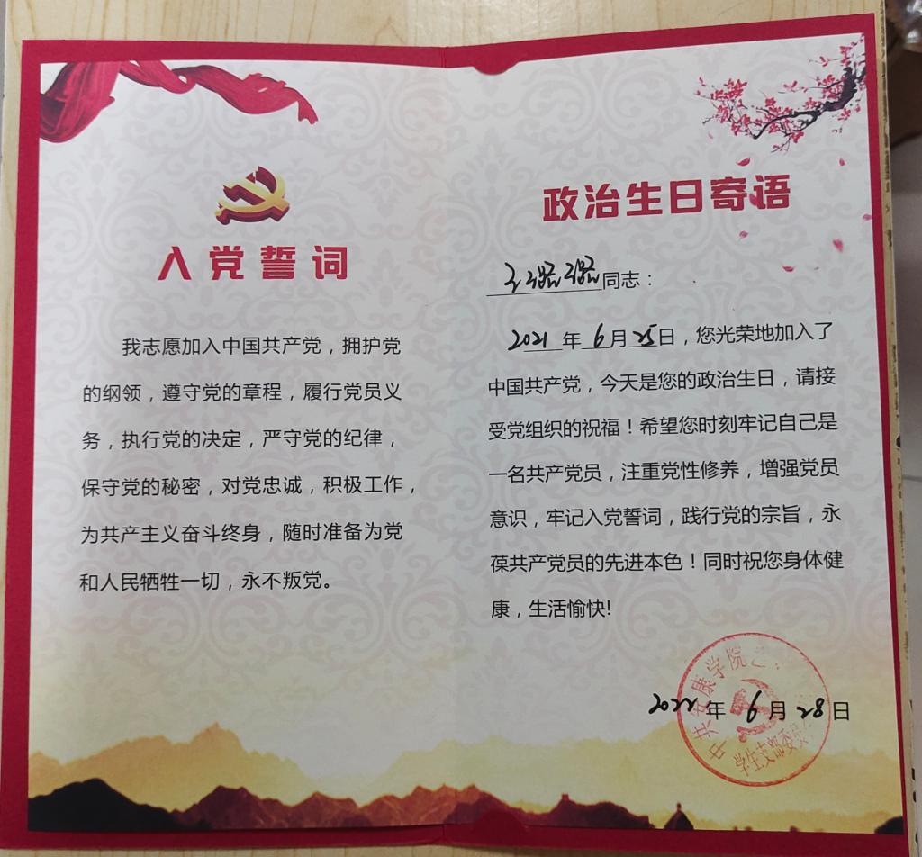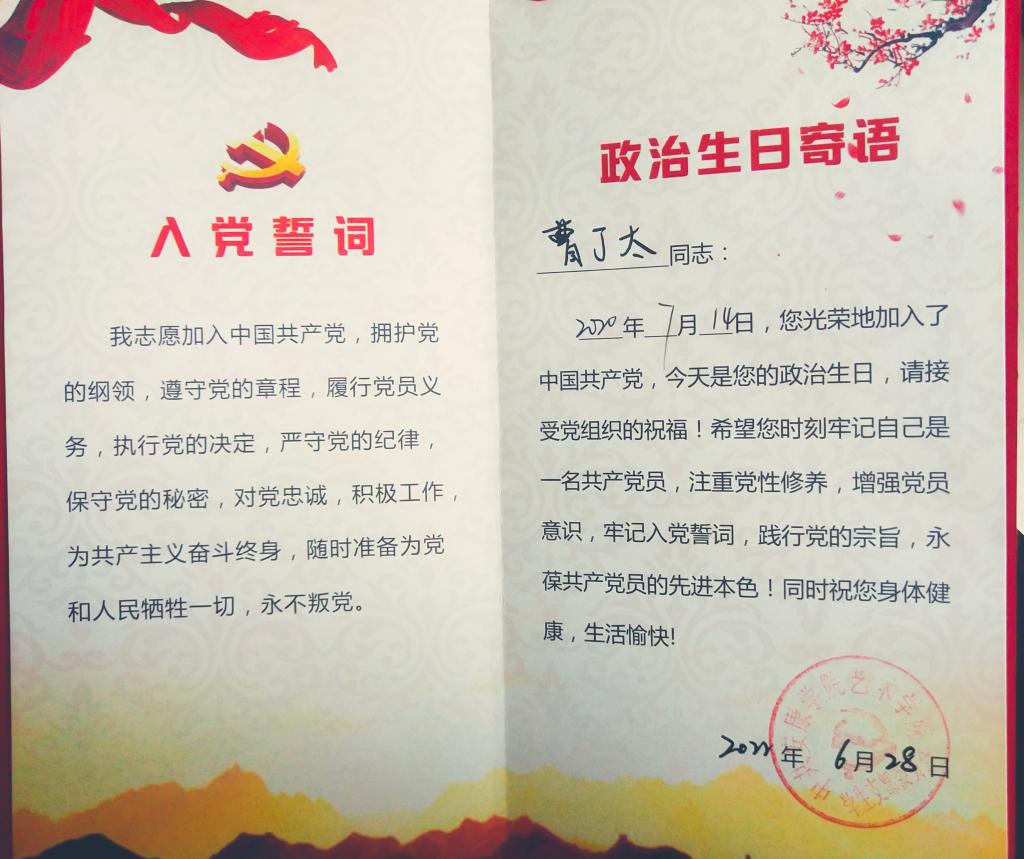 共过一次政治生日·分享一个入党故事。艺术学院学生党支部为全体毕业生党员精心设计了党员政治生日纪念卡。毕业生党员代表曹丁太、惠洁婷分享了入党故事。通过共过政治生日、分享入党故事,使每名学生党员强化身份意识,坚定政治信仰,永葆政治本色。