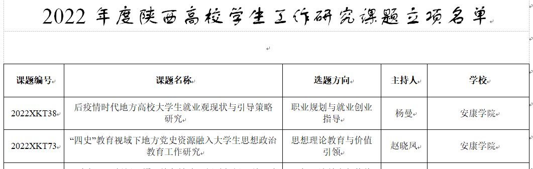 据悉,陕西高校学生工作研究课题由中共陕西省委教育工委每年组织申报,旨在针对我省高校辅导员工作和学生日常教育管理工作中的重点、难点、热点和急需解决的问题开展应用性研究。今年,由我校农生学院辅导员杨曼主持的《后疫情时代地方高校大学生就业观现状与引导策略研究》及教育学院辅导员赵晓凤主持的《“四史”教育视域下地方党史资源融入大学生思想政治教育工作研究》分别获得职业规划与就业创业指导类和思想理论教育与价值引领类立项。