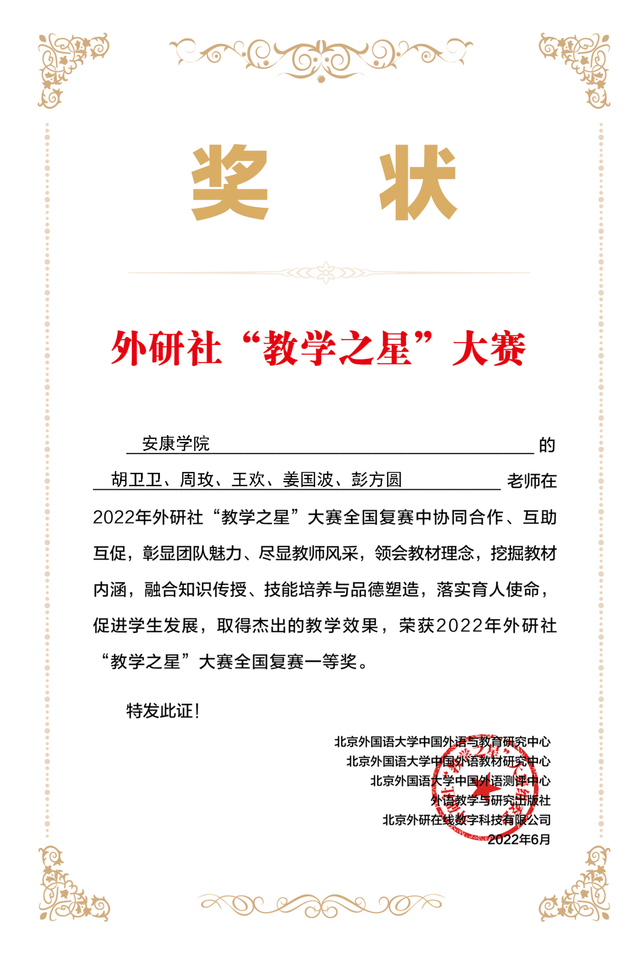 近日,2022年外研社“教学之星”大赛全国复赛结果揭晓。我校外语学院推荐的两个教学团队在全国各高校共计569份参赛作品中脱颖而出:由副院长胡卫卫作为团队负责人的专业教师教学团队(成员:周玫、王欢、姜国波、彭方圆)和向艳丽副教授带领的大学英语教学团队(成员:梁艺凡、邓雪玲、钱莉、周凡雅)分别荣获英语专业组全国复赛一等奖和大学英语组全国复赛一等奖的好成绩。