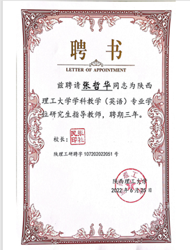 6月25日,我校外语学院副教授张哲华、胡卫卫受聘为陕西理工大学学科教学(英语)专业研究生指导教师,聘期三年。