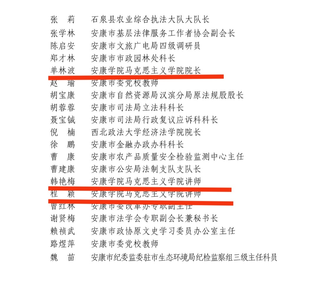 经安康市第五届人大常委会第六次主任会议讨论研究,我校马克思主义学院单林波、冯炜娟、程颖、韩艳梅四位教师获聘为安康市人大常委会立法和备案审查咨询专家。