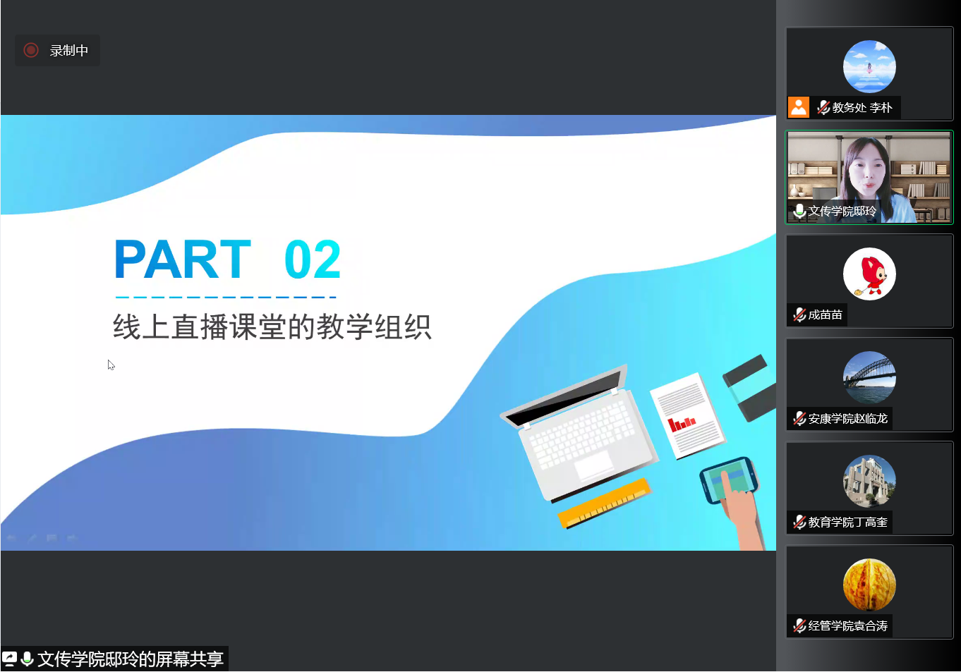 化学与化工学院教师张芯结合《物理化学》课程线上资源的建设、教学组织实施,介绍了如何将混合式教学模式运用到直播课堂,统筹设计学生课前、课中、课后学习全过程,并分享了如何有效融入育人案例达到课程思政育人的目标。艺术学院鄢志莉老师介绍了艺术类课程在线上教学中运用线上教学平台+直播课堂的方法与教学组织实施策略,分享了线上教学中如何采用多种方法有效调动学生的学习积极性,促进线上教学效果的提升。