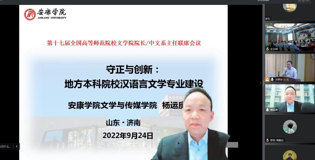 9月24-25日,第十七届全国高等师范院校文学院院长/中文系主任联席会议在山东师范大学召开,会议通过线上线下结合的方式举行,全国80余所师范院校的150余名文学院院长、中文系主任参加了会议。我校文学与传媒学院院长杨运庚教授以线上的方式参加了会议并做了大会报告。