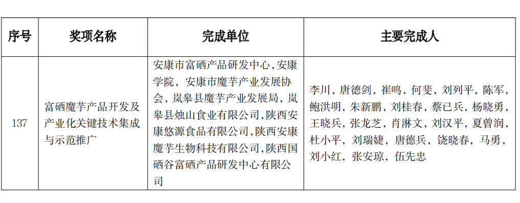 近日,2019-2021年度全国农牧渔业丰收奖获奖名单公布,由我校魔芋科技创新团队李川教授主持,办学顾问崔鸣研究员及何斐博士、朱新鹏教授等团队成员共同完成的“富硒魔芋产品开发及产业化关键技术集成与示范推广”项目荣获2019-2021年度全国农牧渔业丰收奖三等奖。