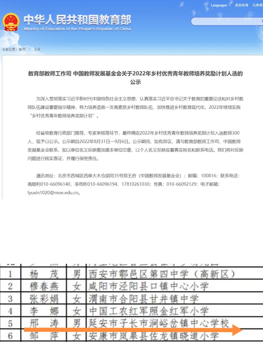近日,教育部教师工作司中国教师发展基金会开展的2022年“乡村优秀青年教师培养奖励计划”结果公布,陕西省6人入选,我校旅环学院地理专业2010届毕业生邢涛同学入选。