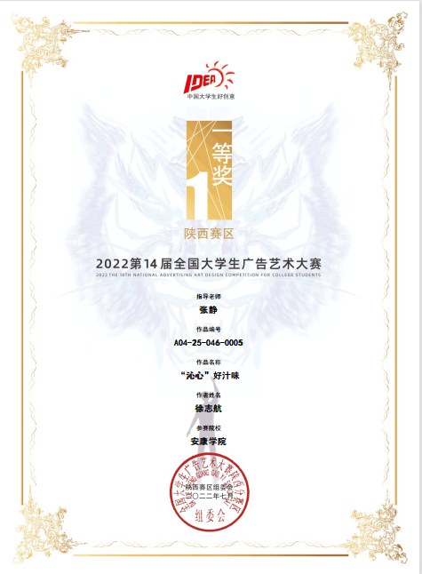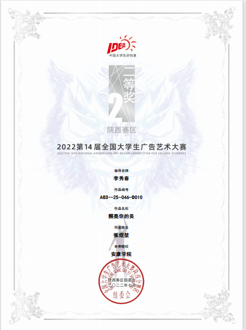 近日,第十四届全国大学生广告艺术大赛陕西赛区比赛结果公布,我校艺术学院学生再获佳绩,获得一等奖1项、二等奖5项、三等奖5项。