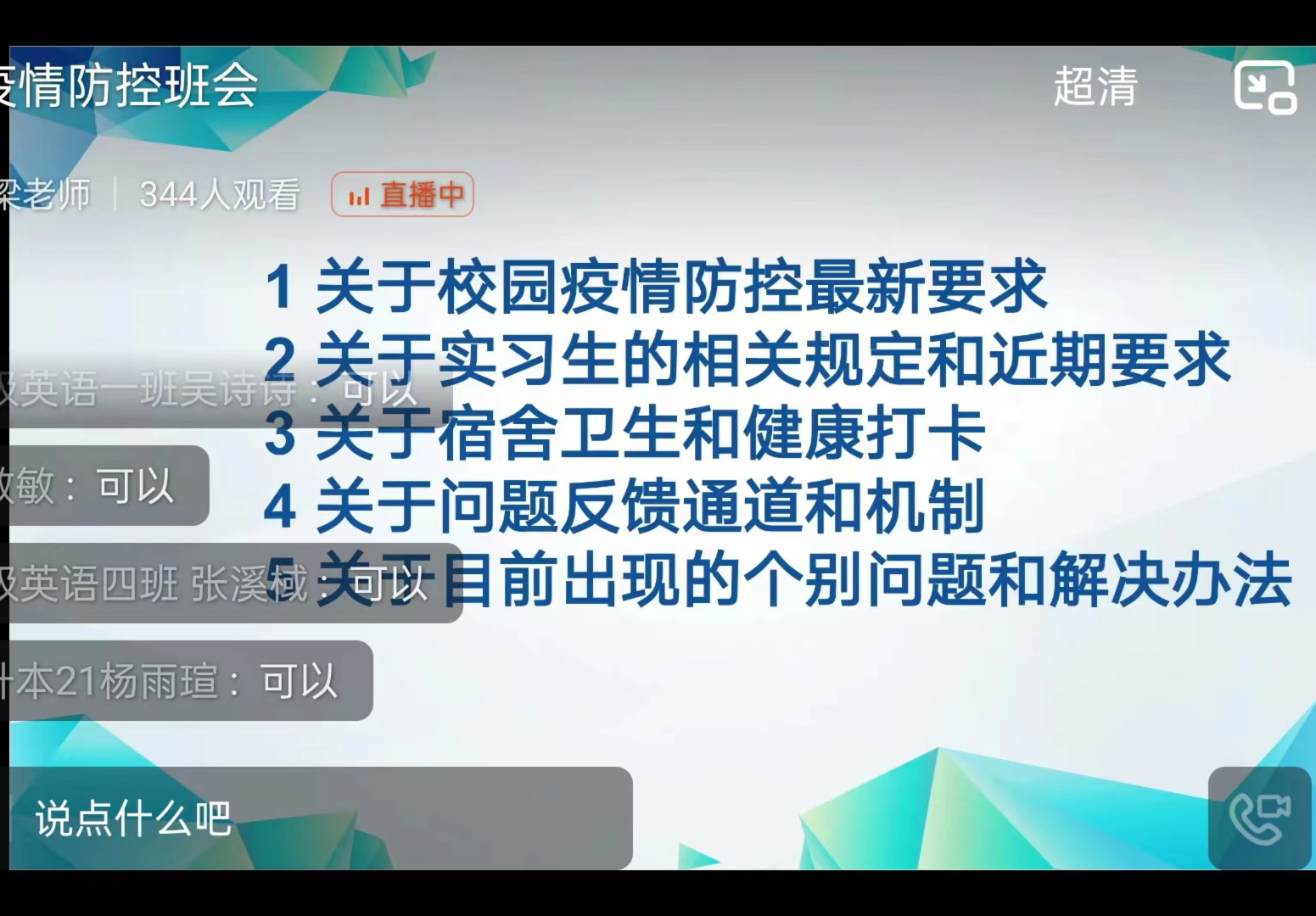 专班入校工作期间,从校领导到中层干部到普通教师,严格遵守要求吃住在校,值班人员睡在办公室,食堂工作人员睡在餐厅……;校园居住的老师、家属及其他人员均能积极配合,做好自我防护、按时核酸检测、走生活区专用通道等;同学们克服长时间“非必要不出校”的防疫要求,积极参加核酸检测,戴口罩、积极做好自我防护,为学校做好防疫工作提出许多建设性意见建议……,护校队、校学生会等学生组织自发联合起来,组建了“防疫纠察队”,对校内的防疫安全隐患进行排查与规正,志愿者在食堂、路口等维护秩序,为同学们提供帮助和服务。全校师生齐动员,凝聚起抗击疫情的磅礴力量。