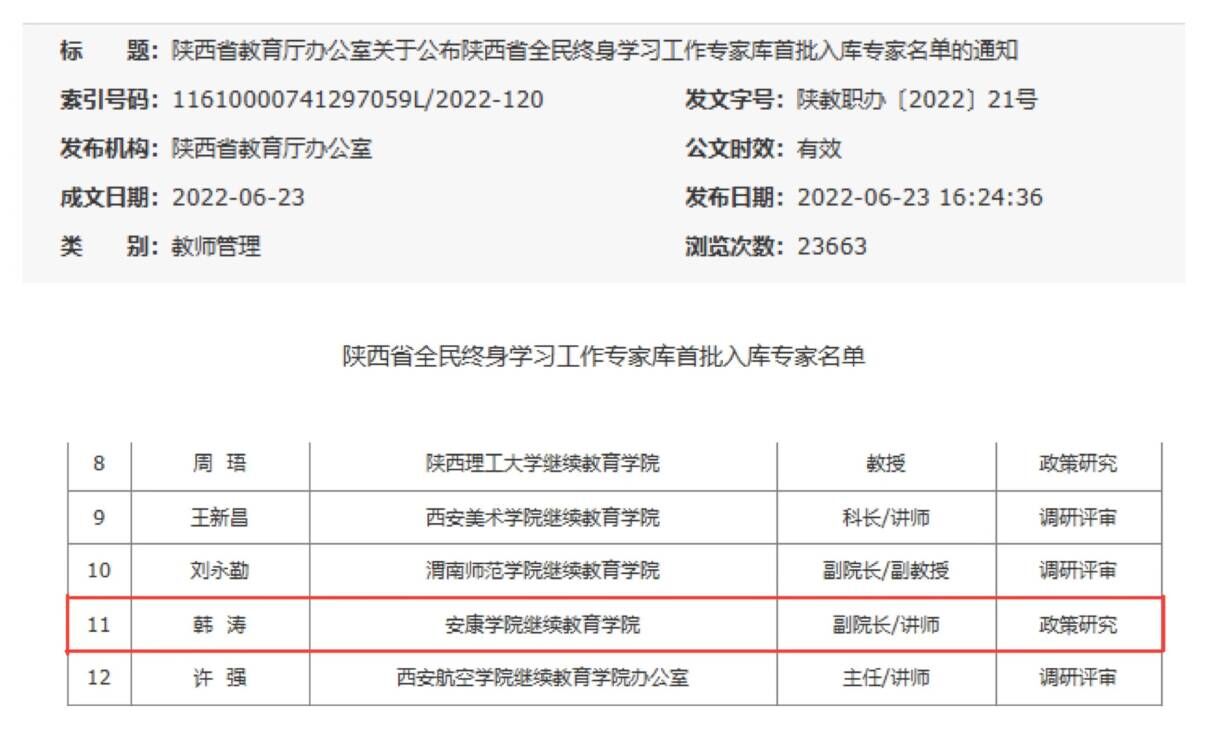 根据《陕西省教育厅办公室关于公布陕西省全民终身学习工作专家库首批入库专家名单的通知》,我校继续教育学院韩涛同志入选首批陕西省全民终身学习工作专家库。