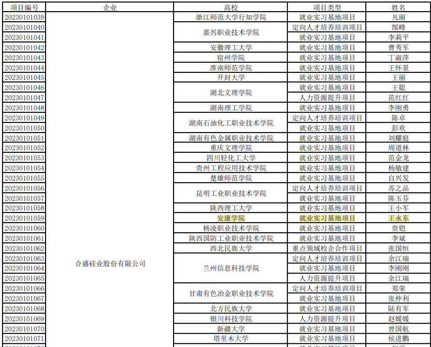 近日,教育部高校学生司印发了《关于公布第二期供需对接就业育人项目立项名单的通知》,安康学院化学化工学院联合合盛硅业股份有限公司申报的就业实习基地项目获批教育部第二期供需对接就业育人项目立项。