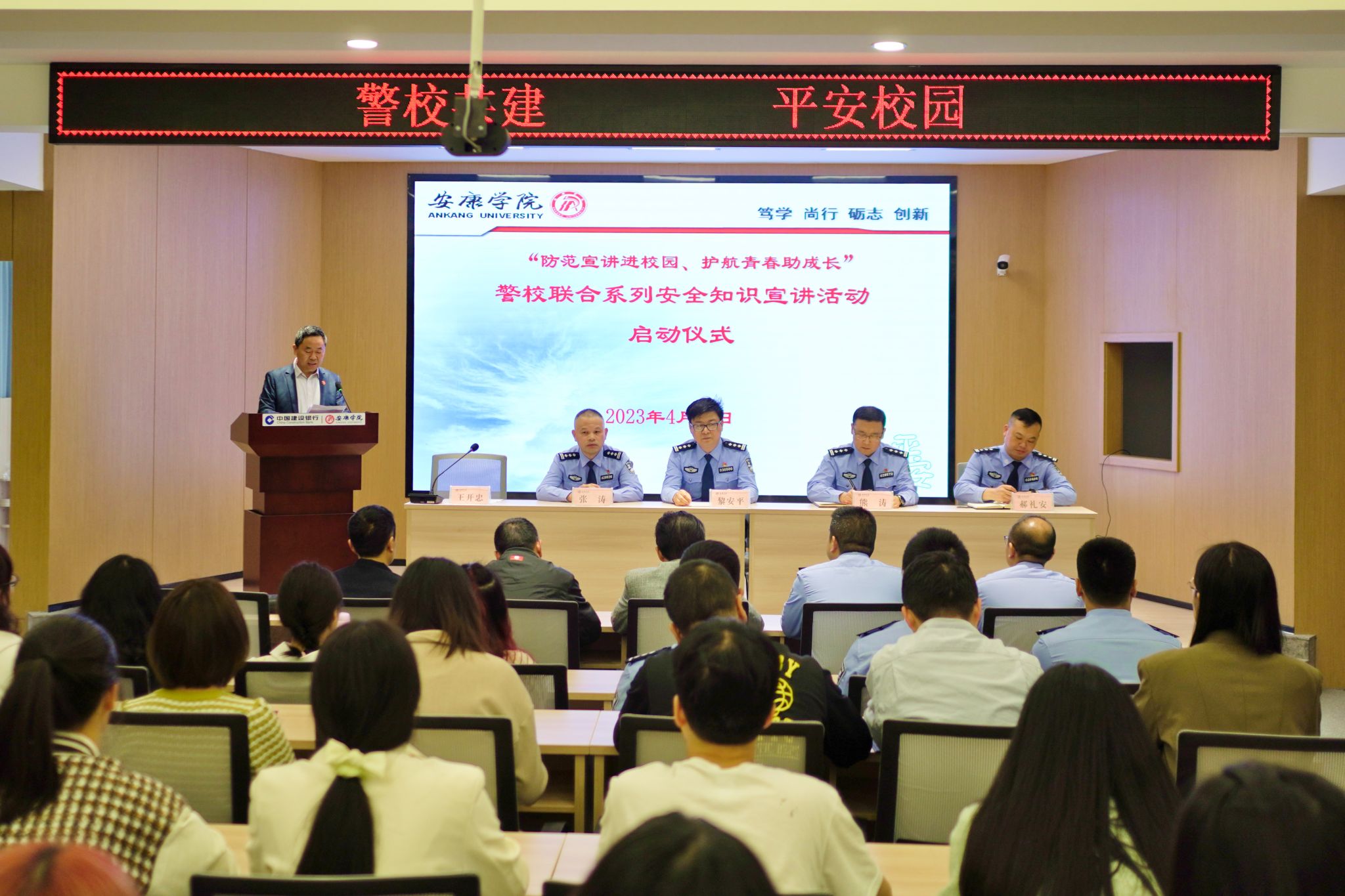 4月27日上午,安康市公安局、安康市公安局高新分局、安康市公安局汉滨分局,安康学院“防范宣讲进校园、护航青春助成长”警校联合系列安全知识宣讲活动启动仪式在我校乡村振兴学院多功能报告厅举行。