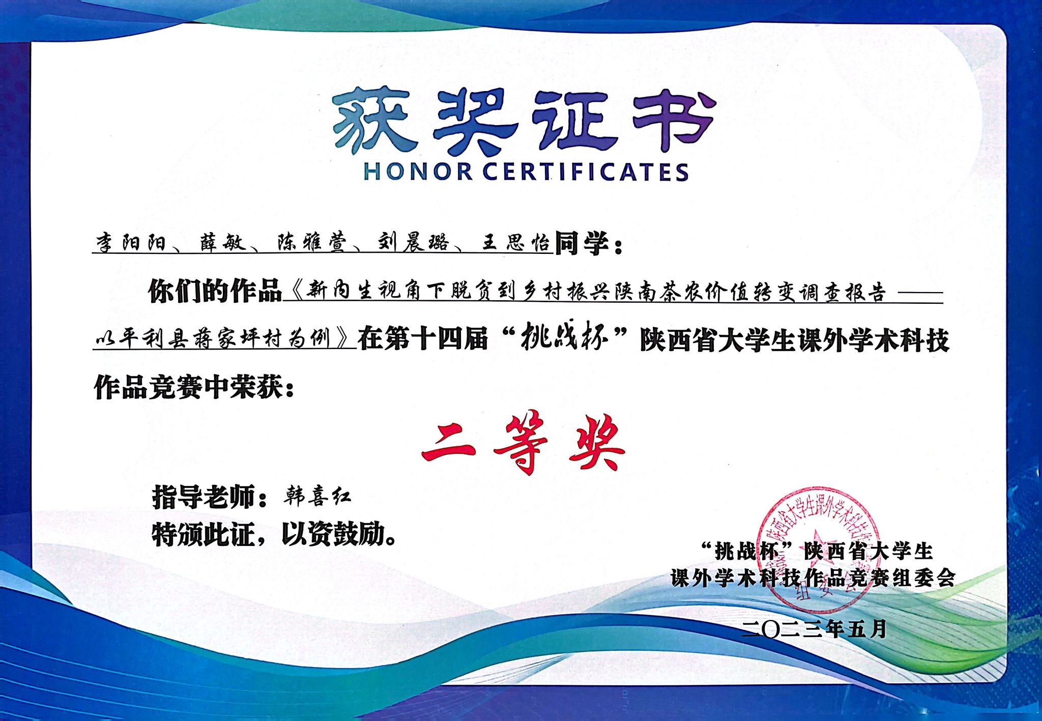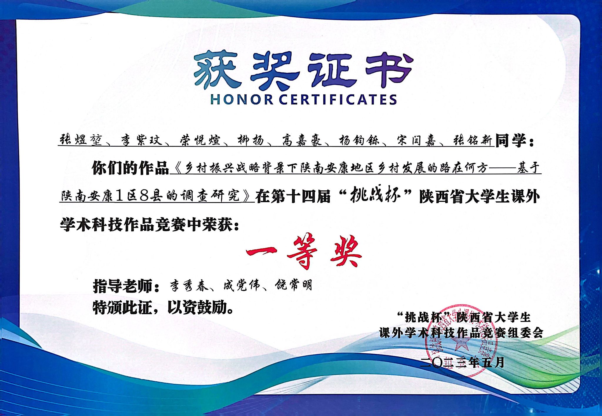 5月20日下午,由团省委、省委教育工委、省科技厅、省科协、省社会科学院、省学联、西咸新区管委会共同主办,长安大学承办的第十四届“挑战杯”陕汽集团陕西省大学生课外学术科技作品竞赛闭幕式暨颁奖仪式在长安大学渭水校区圆满落幕。我校参赛作品《乡村振兴战略背景下陕南安康地区乡村发展的路在何方——基于陕南安康1区8县的调查研究》荣获一等奖、《基层党建推进脱贫攻坚成果与乡村振兴有效衔接调查——以秦鲁两省五村为例》、《新内生视角下脱贫到乡村振兴陕南茶农价值转变调查报告——以平利县蒋家坪村为例》2件作品荣获二等奖。