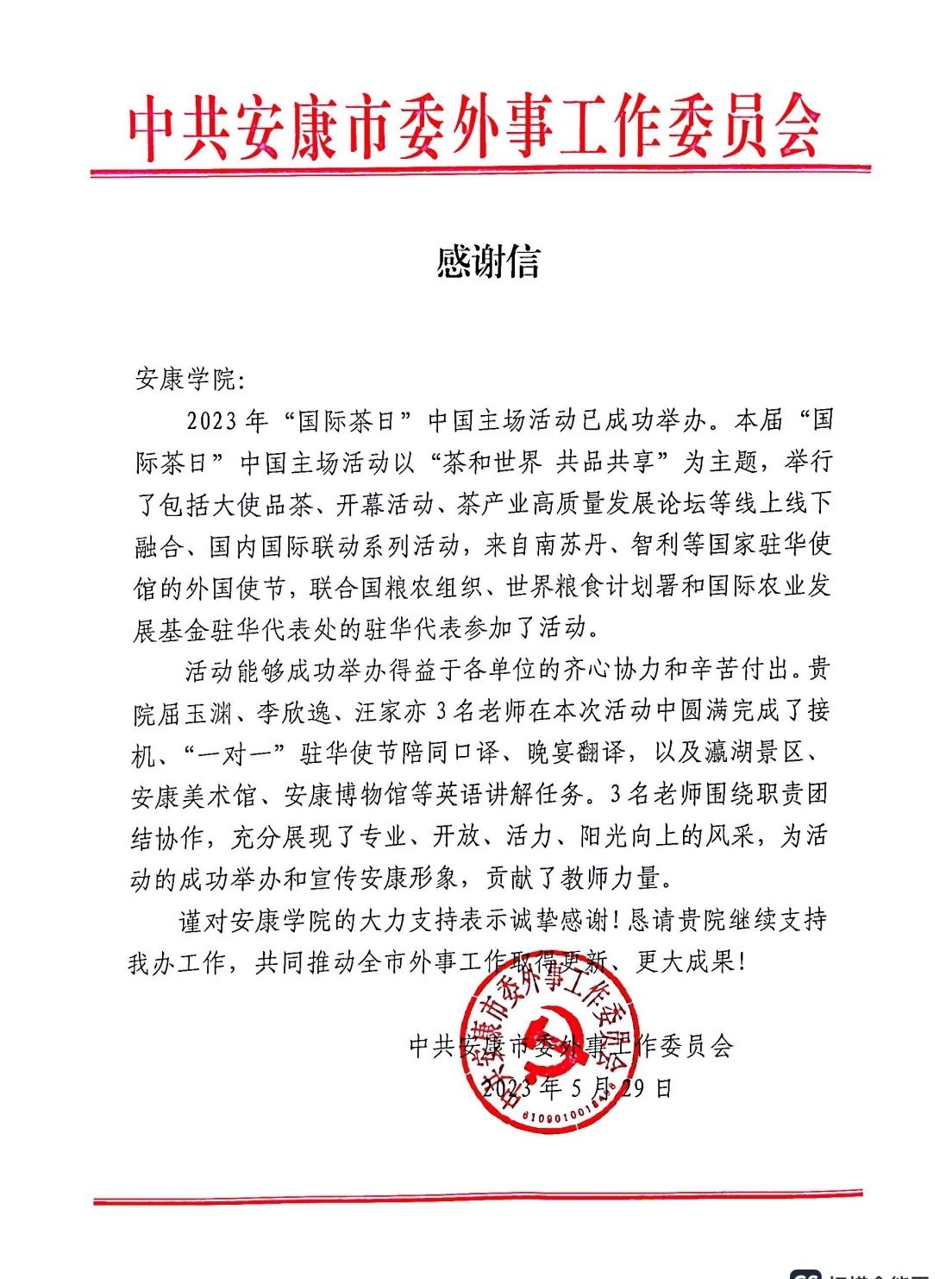 为助力此次盛会圆满召开,5月15日,安康市委外事工作委员会商函我校党政办和外语学院,抽调我校文传学院李欣逸、外语学院汪家亦、巡察办屈玉渊三位青年教师,受邀担任本次盛会英语翻译志愿服务工作。会议期间,三位青年教师承担了外宾接机、多国驻外使节“一对一”陪同口译、“国际茶日”省市领导嘉宾翻译,以及瀛湖景区、安康美术馆和安康博物馆等英语讲解相关志愿服务活动,出色完成了各项服务保障工作,助力盛会各项任务完满完成,受到了驻外使节、市政府领导、有关部门负责同志和与会人员一致肯定,展现了我校青年教师良好形象。