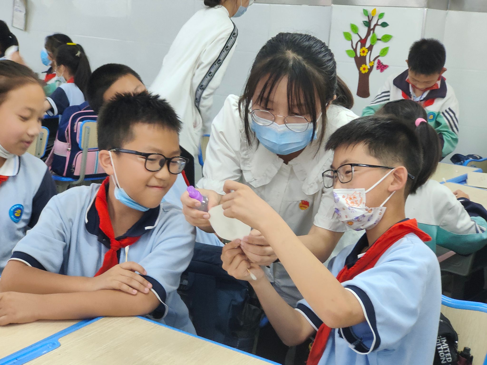 科普活动以观察、讲解、体验、探究等多种方式,带领学生走进科学,体验丰富多彩的互动实验,感受科学氛围。王雪博士从“什么是化学变化”,到生活中的衣、食、住、行样样离不开化学,向学生们普及了生活中的化学知识。随后,由学生党员和积极分子组成的科普团向小学生们演示了“星火燎原”“魔法药水”“无中生有”等富有趣味性和观赏性的小实验。妙趣横生的化学实验、新颖奇特的教学手段给小学生们播下了科学种子,点燃了科学梦想。