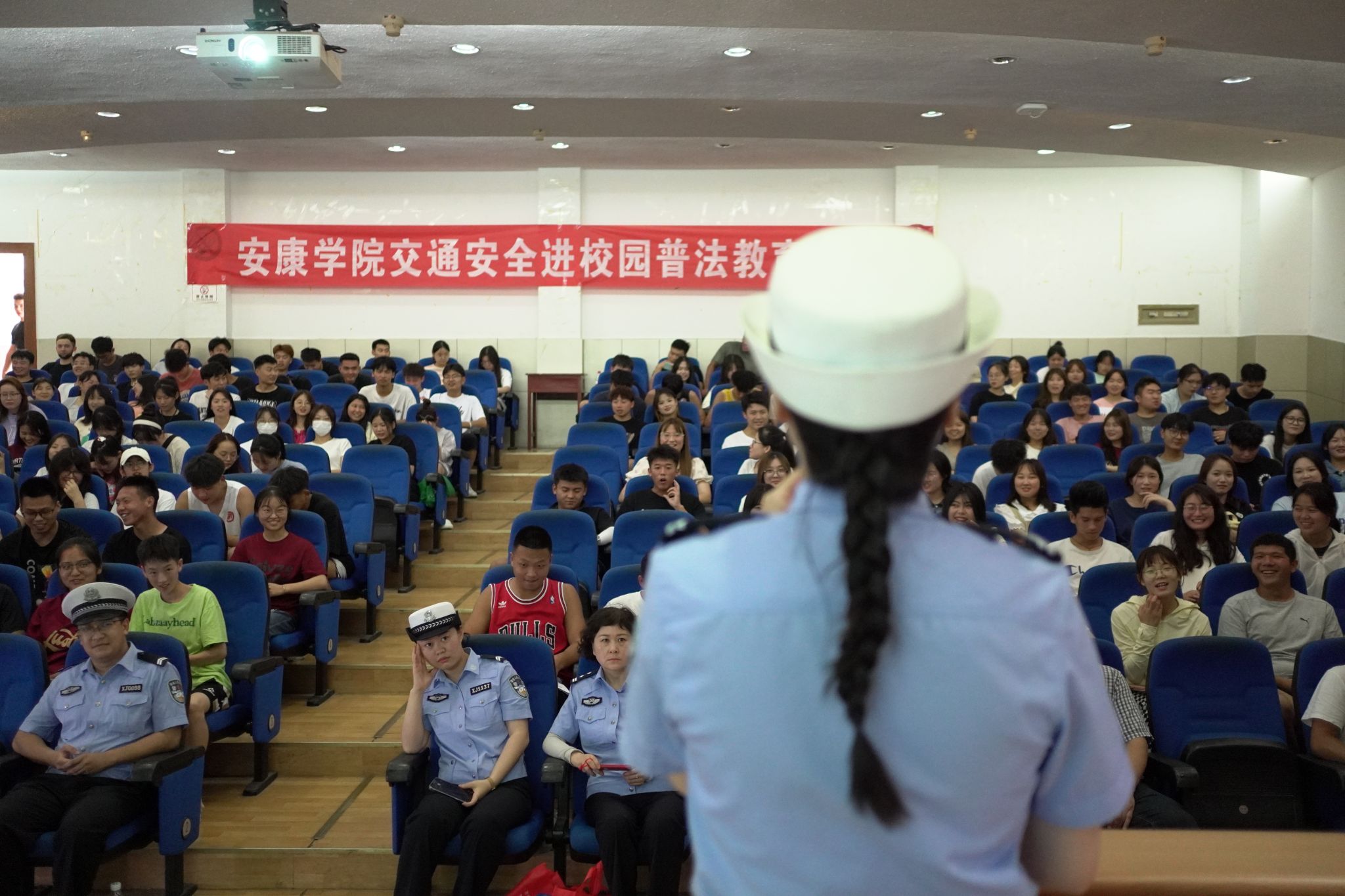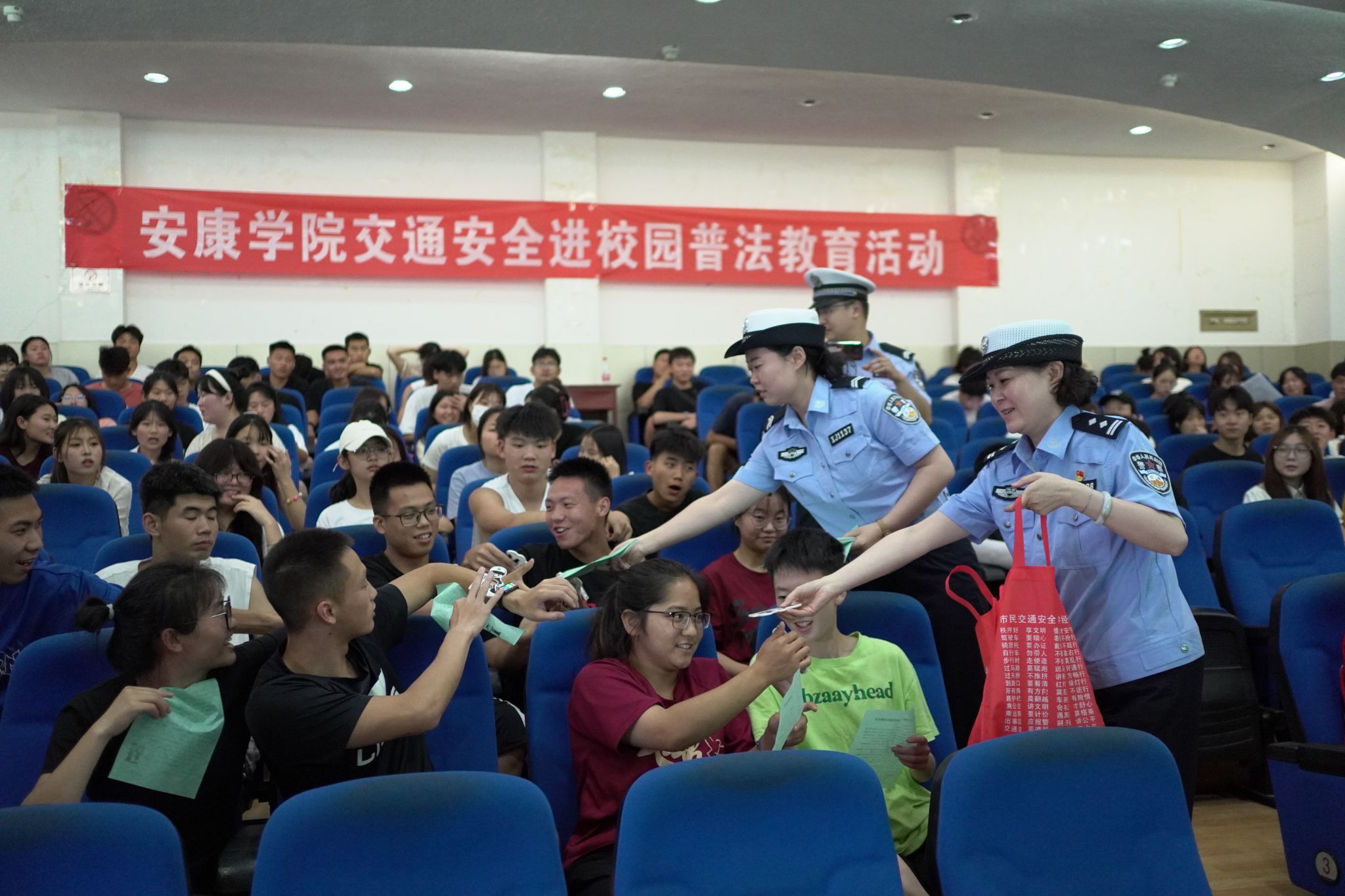 近日,我校联合市公安局汉滨分局交警大队、高新分局交警大队,分别在江南、江北校区开展交通安全进校园活动。各二级学院学生会干部、班干部、安全信息员约500余人参加了活动。
