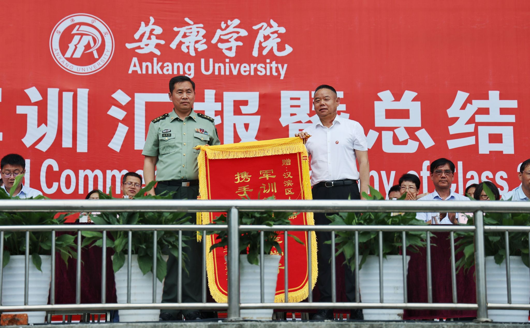 安永强代表学校向协调我校本次军训的汉滨区人武部赠送了锦旗。
