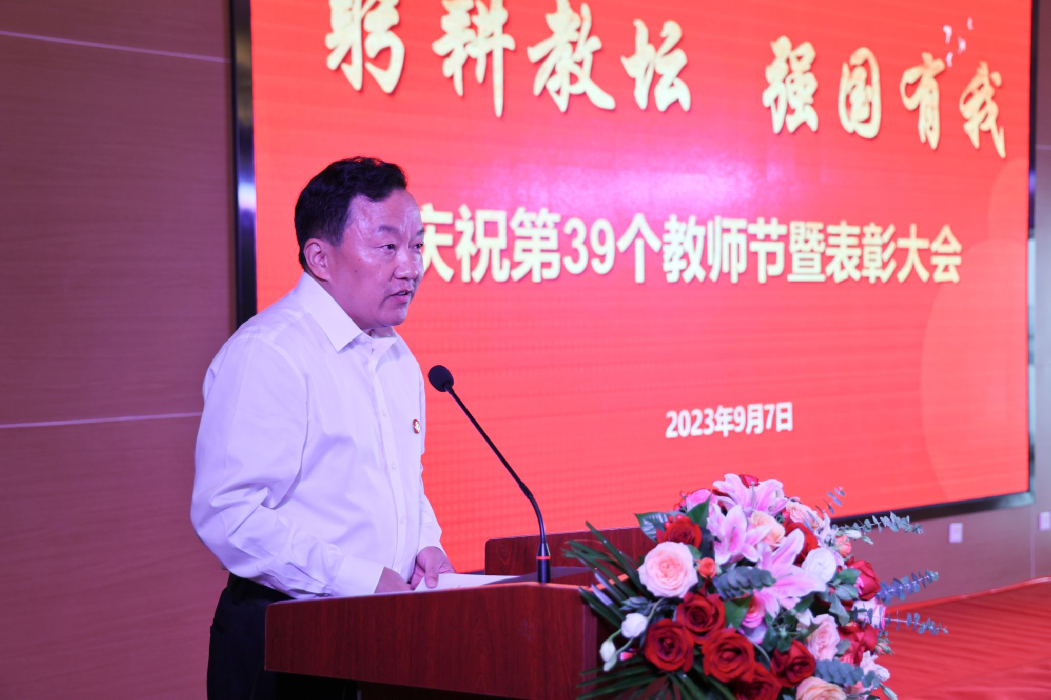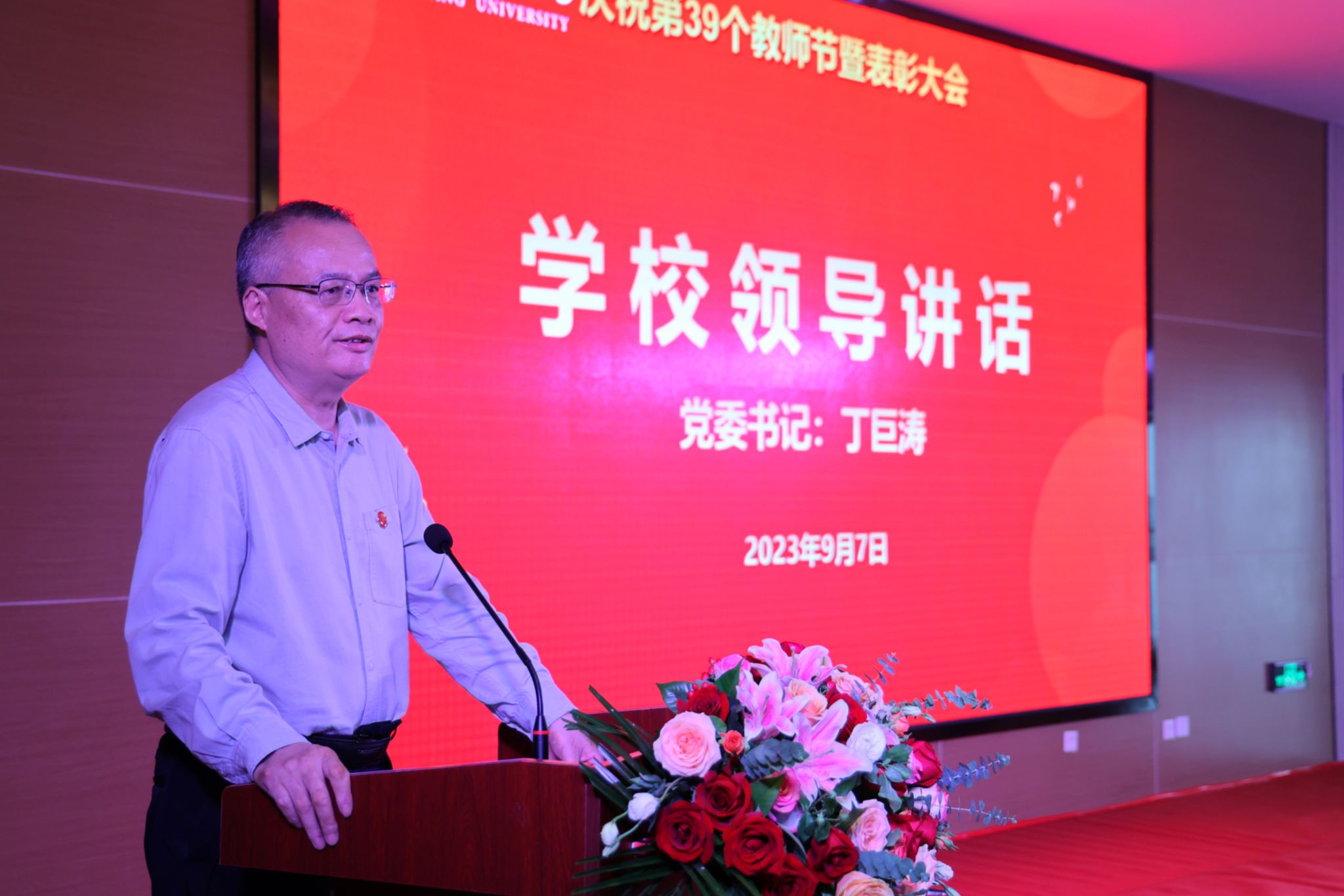 在第39个教师节来临之际,为弘扬尊师重教风尚,进一步激励全体教职工坚持立德树人使命,争做党和人民满意的“四有”好老师和“四个引路人”,9月7日下午,我校在江北校区图书馆报告厅举行庆祝第39个教师节暨表彰大会。学校党委书记丁巨涛,校长钟生海,党委副书记、纪委书记、监察专员安永强,副校长余谦出席大会,并为各类荣誉称号获得者颁奖。本次大会以“躬耕教坛,强国有我”为主题,丁巨涛向全校教师致以节日问候并讲话,钟生海主持会议。