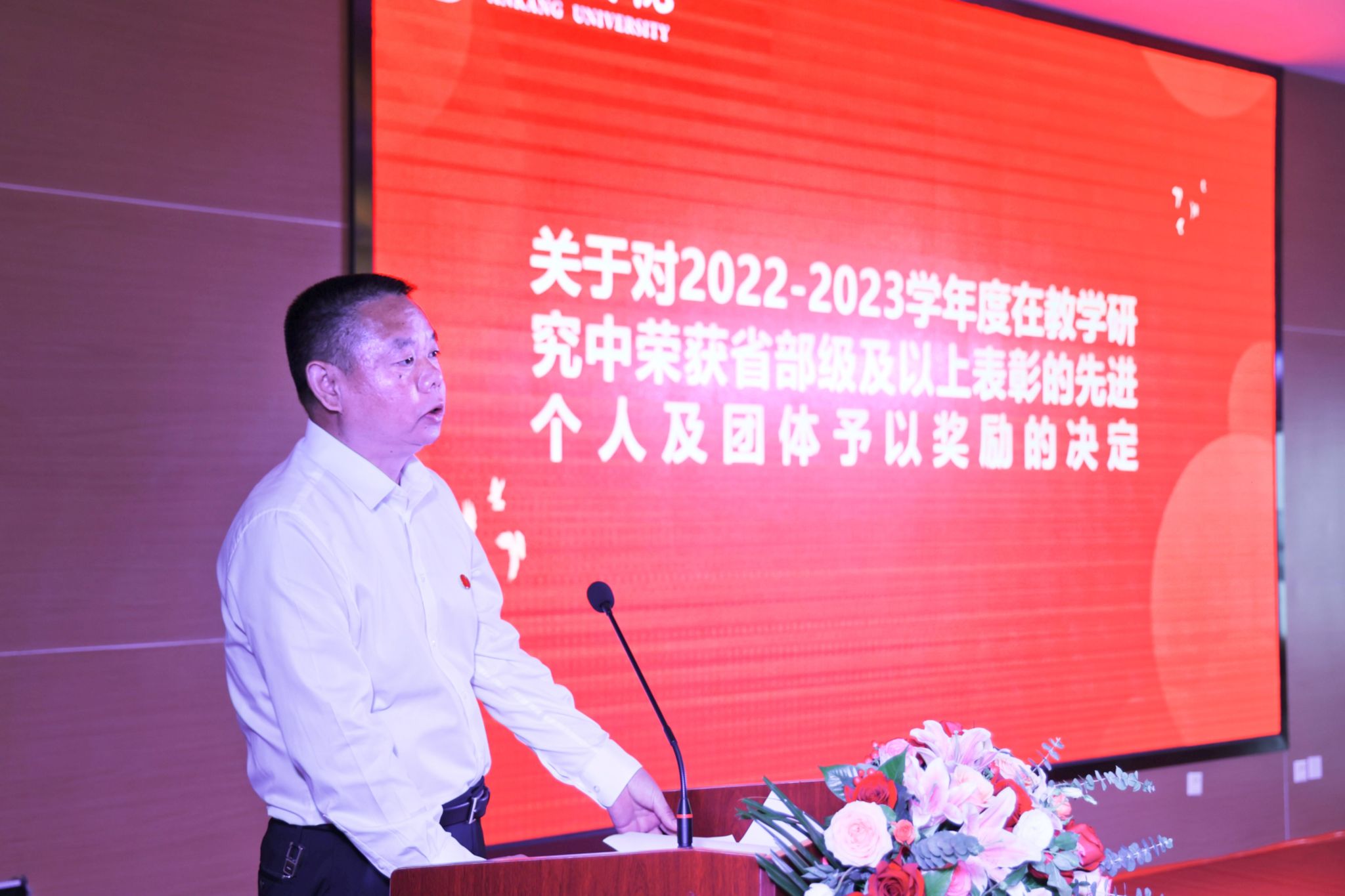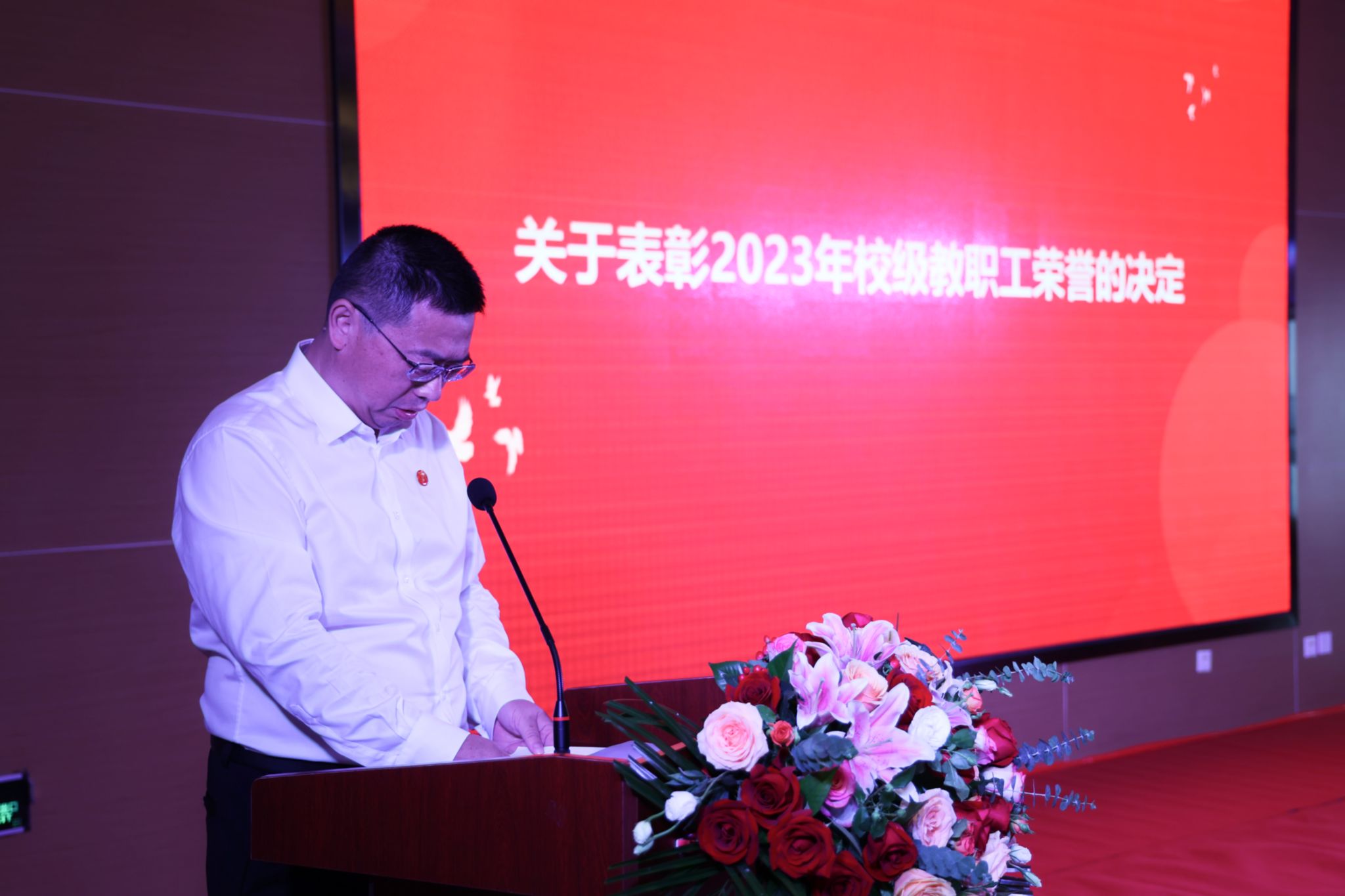 大会在庄严的国歌声中拉开帷幕。安永强宣读了《关于对2022-2023学年度在人才建设及科研工作中荣获省部级及以上表彰的先进个人及团体予以奖励的决定》和《关于对2022-2023学年度在教学研究中荣获省部级及以上表彰的先进个人及团体予以奖励的决定》,余谦宣读了《关于表彰2023年校级教职工荣誉的决定》和《关于对 2022-2023学年度荣获省部级及以上表彰的先进集体给予表彰的决定》。