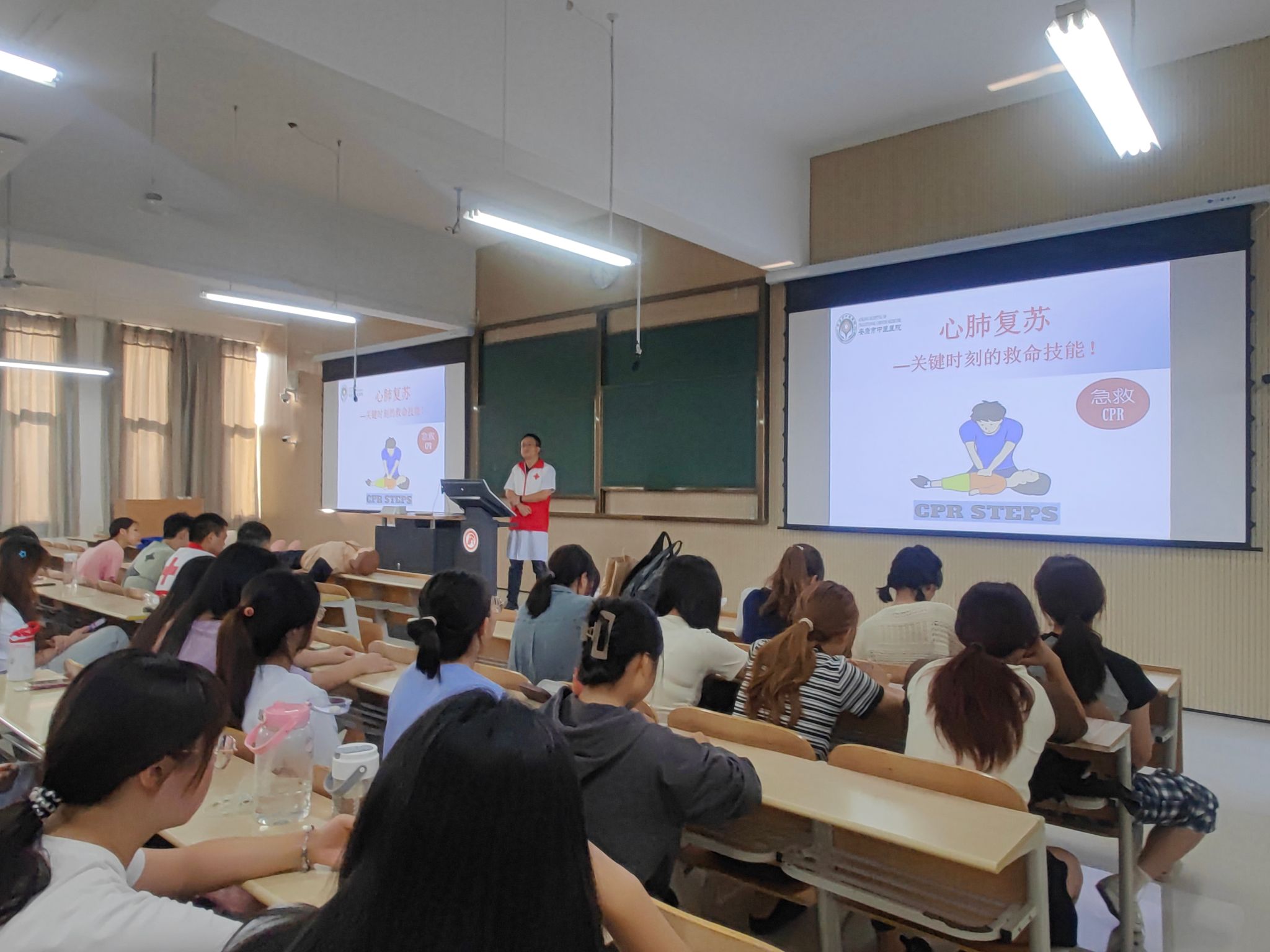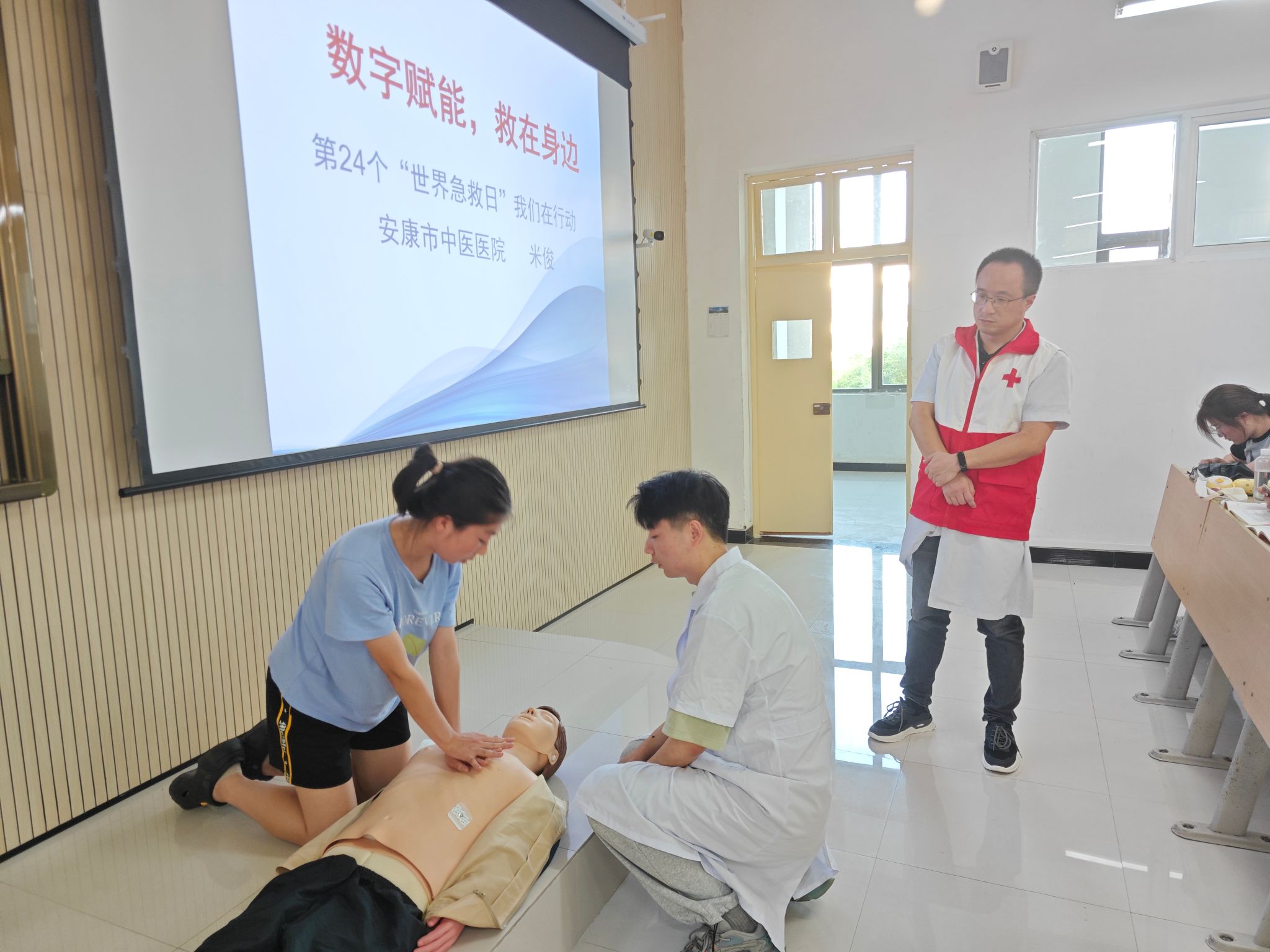 在第24个“世界急救日”来临之际,我校联合安康市中医医院于9月7日在江北校区开展了以“数字赋能‘救'在身边”为主题的“世界急救日”宣讲活动,200余名无课师生聆听了讲座。