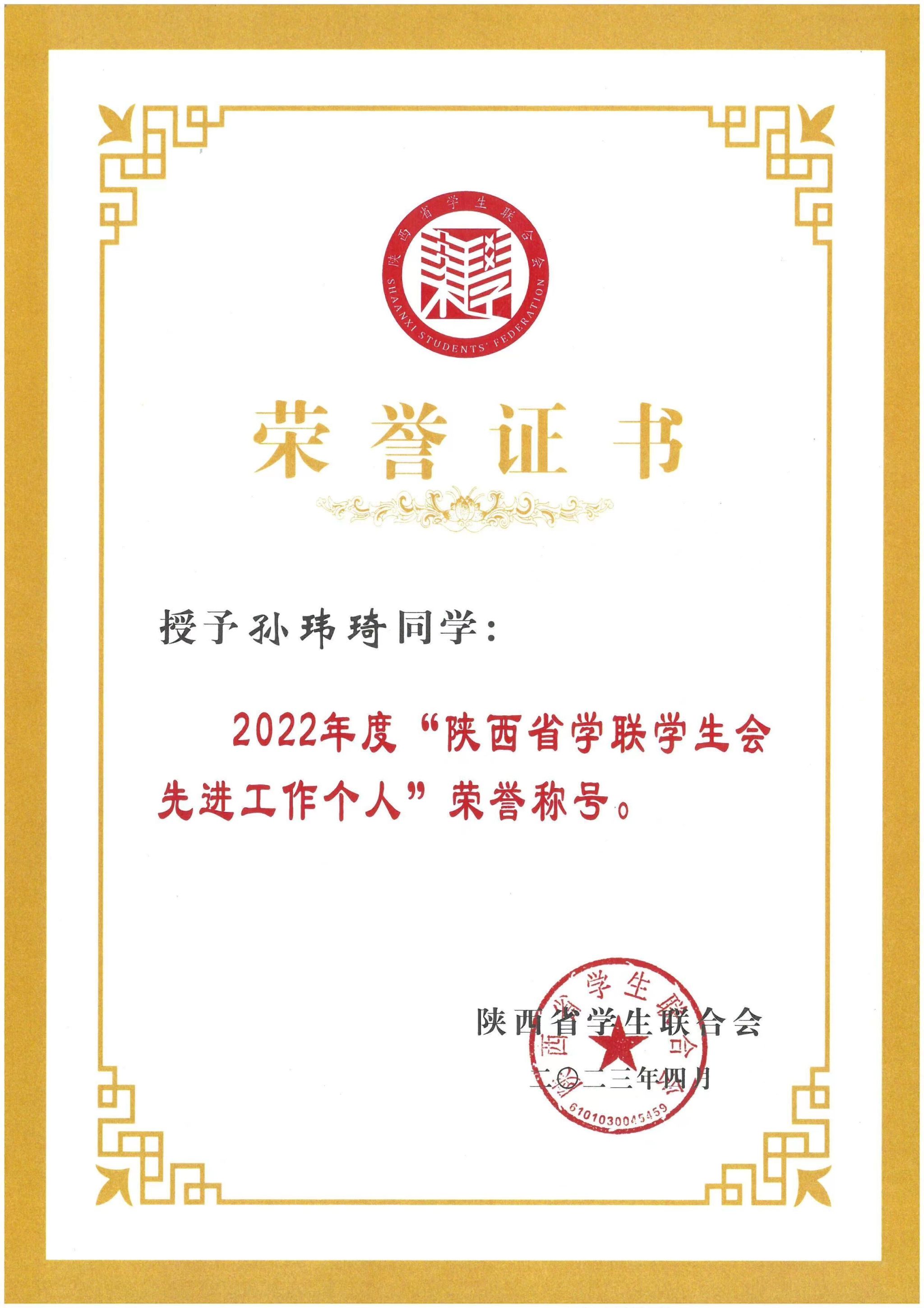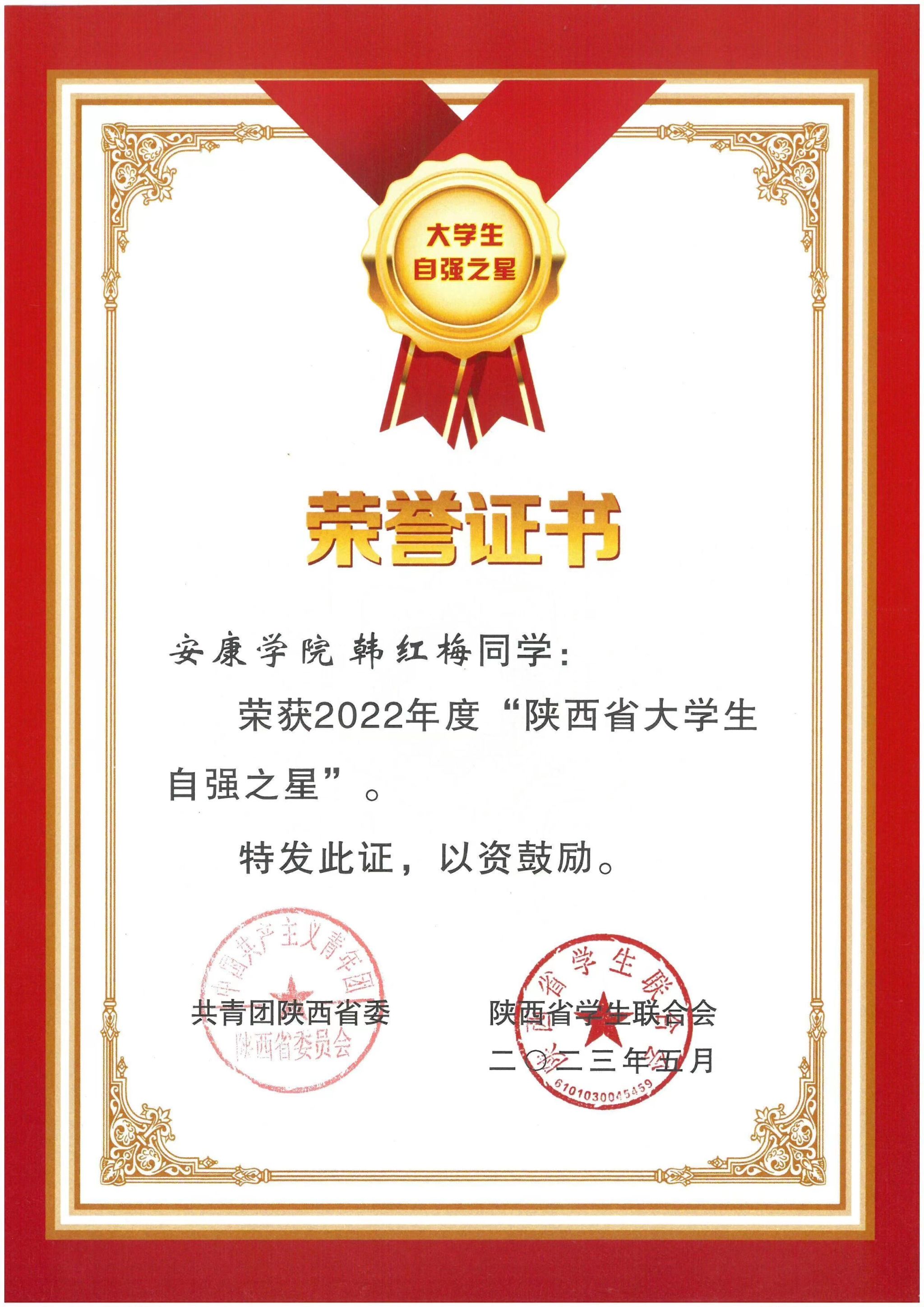 近日,共青团陕西省委、陕西省学生联合会公布了陕西省学联学生会先进工作个人和陕西省大学生自强之星的评选结果。通过组织推荐、省级遴选,我校化学化工学院2020级化学工程与工艺1班孙玮琦获得“陕西省学联学生会先进工作个人”荣誉称号,体育学院2020级体育教育3班韩红梅获得“陕西省大学生自强之星”荣誉称号。