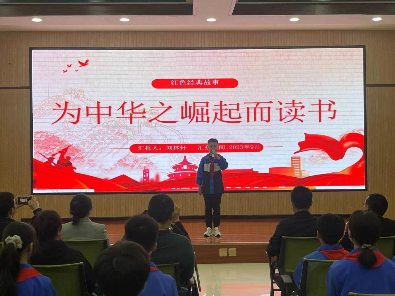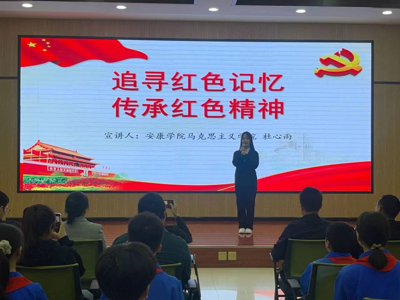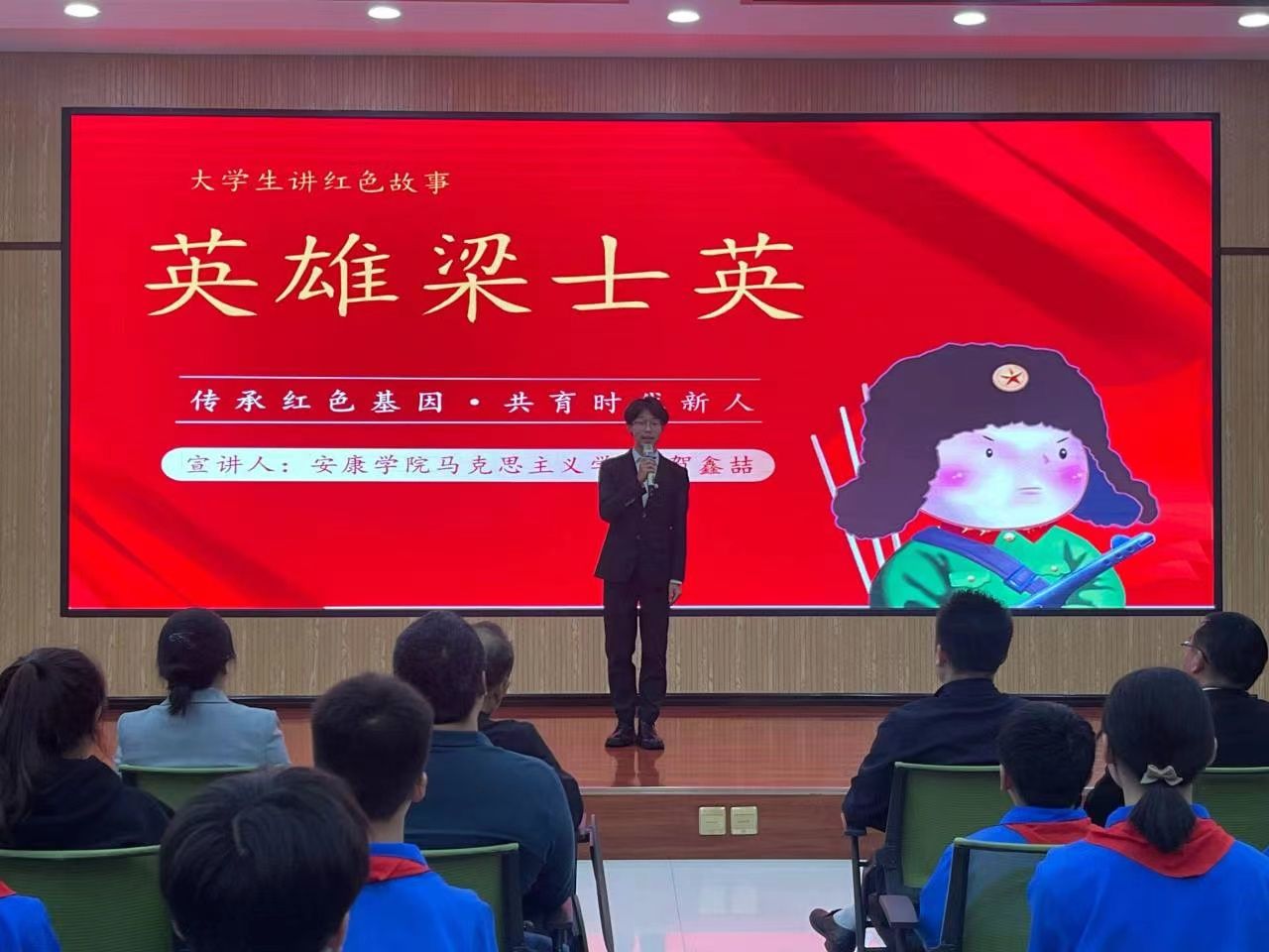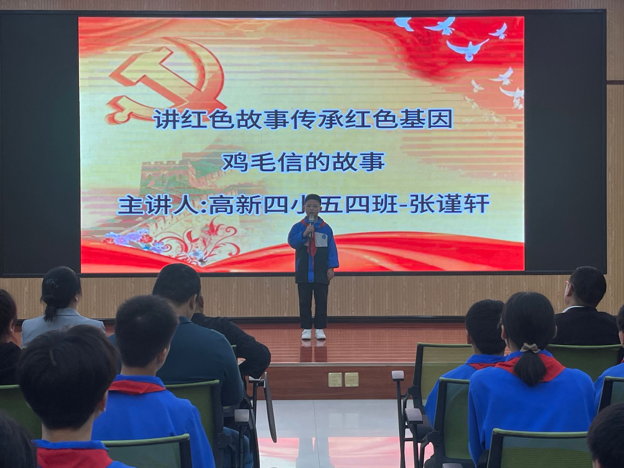 在红色故事分享环节里,高新四小五(四)班学生张谨轩、刘林轩分享了“鸡毛信的故事”“为中华之崛起而读书”,我校思想政治教育专业学生贺鑫喆、杜心雨分享了“英雄梁士英”“一支钢笔背后的红色记忆”,大家从一个个红色故事的讲述中追溯红色血脉,重温峥嵘岁月,感悟信仰之源。随后,全体师生共同朗诵诗歌《我们爱祖国》,共庆祖国生日,传承红色基因,争做时代新人。