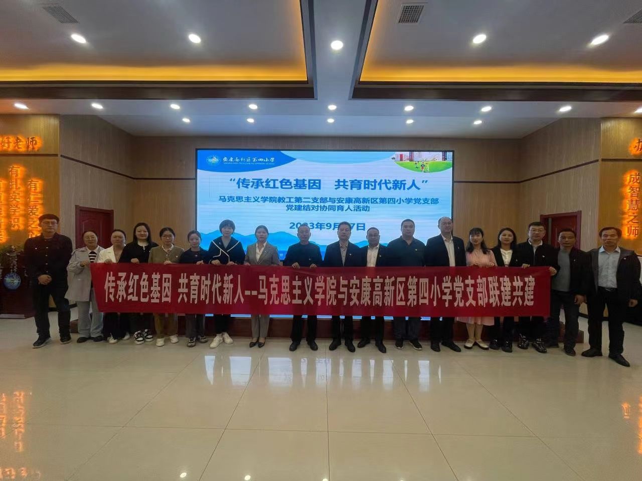 9月27日下午,我校马克思主义学院教工第二党支部赴安康高新区第四小学开展以“传承红色基因,共育时代新人”为主题的党建结对暨主题党日活动。安康高新区第四小学党支部书记、校长张平德,副书记王井波,组织委员、副校长张荣护,部分党员及师生代表,我校何家理教授、马克思主义学院教工第二党支部全体党员及红色故事学生宣讲团成员等参加了此次活动。