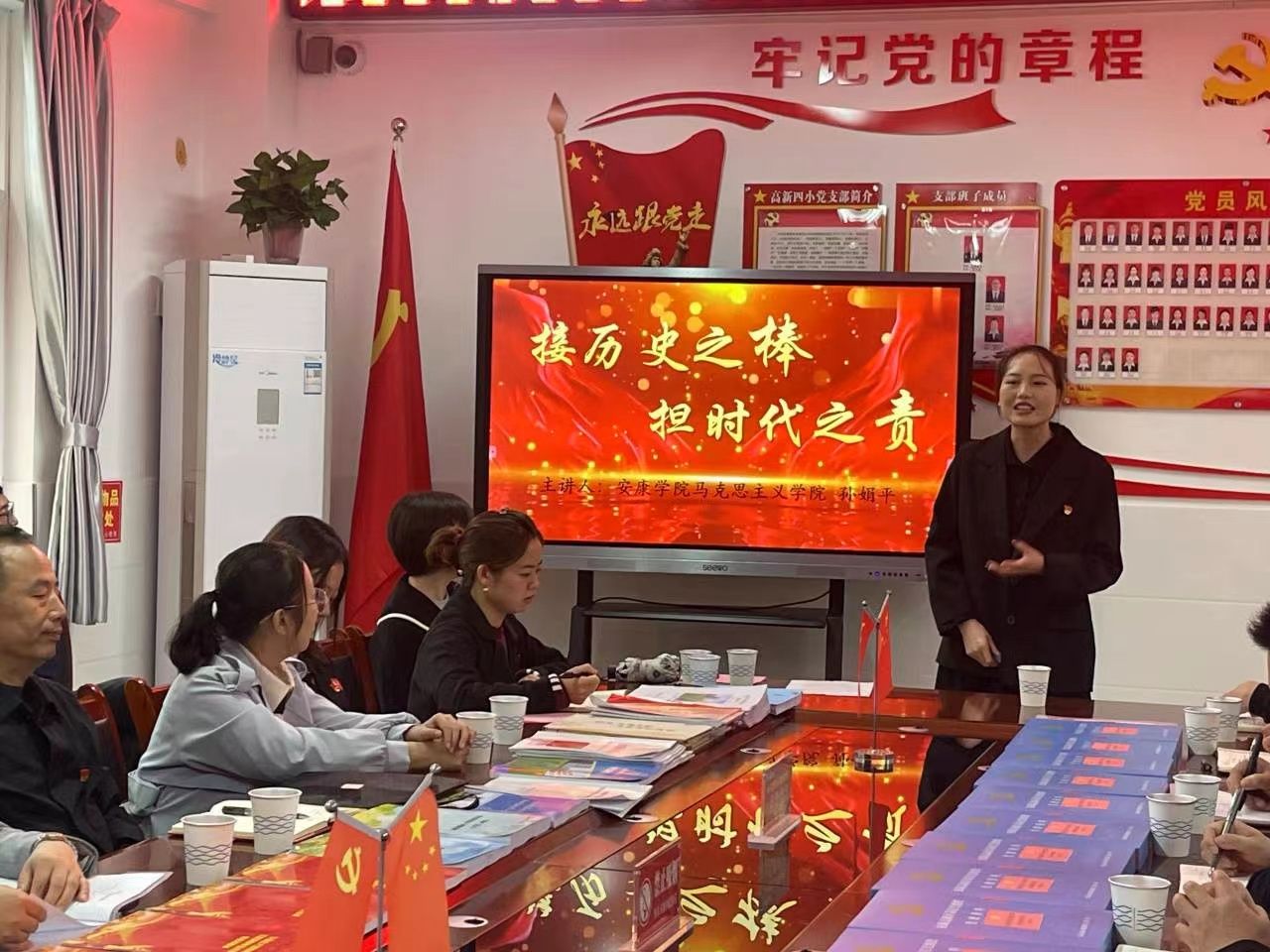 在主题党课环节,张平德结合高新四小的党建工作,带领大家进一步学习领会党的二十大精神和习近平新时代中国特色社会主义思想,为大家讲授了一堂生动精彩的党课。我校马克思主义学院青年教师代表孙娟平以《接历史之棒,担时代之责》为题做了专题党课,激励党员师生坚定理想信念,振奋精神,练就过硬本领,做有理想、敢担当、能吃苦、肯奋斗的新时代好青年。