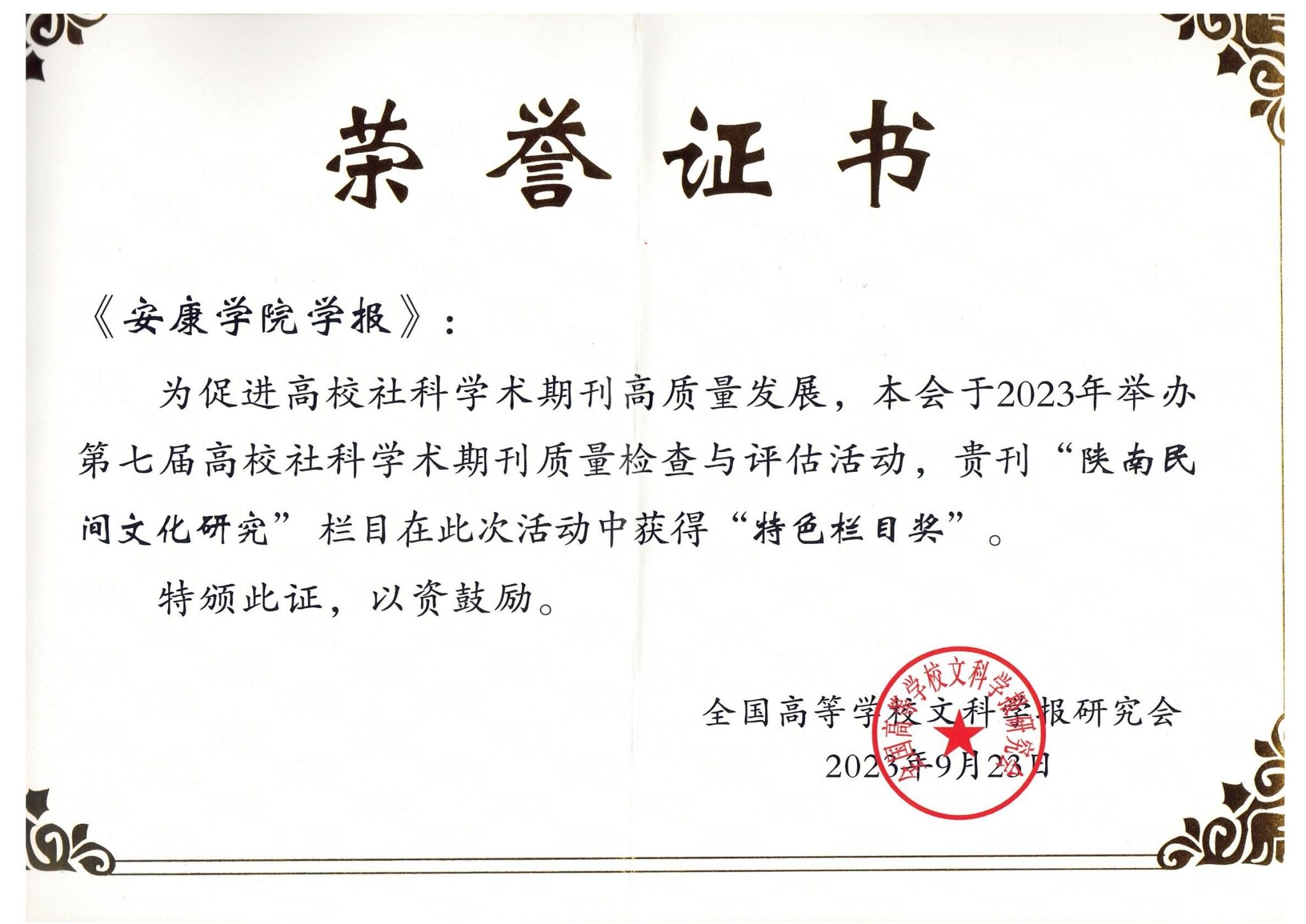9月22日至24日,全国高等学校文科学报研究会成立35周年庆祝大会暨九届三次理事会会议在湖北宜昌举行。会议公布了第七届高校社科学术期刊质量检查与评估结果。《安康学院学报》“陕南民间文化研究”栏目获“特色栏目奖”。