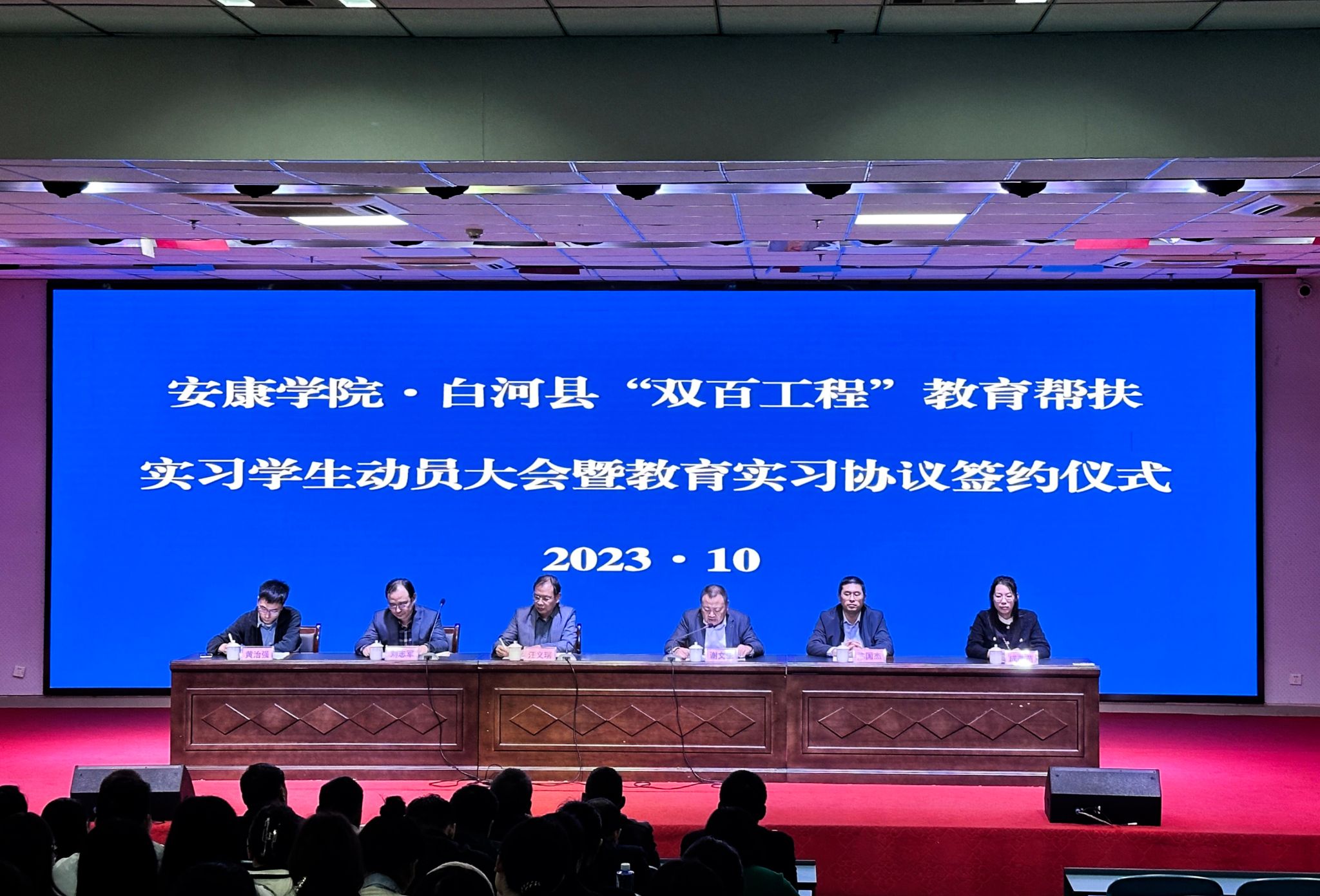 10月9日上午,安康学院·白河县教育帮扶实习学生动员大会暨教育实习协议签约仪式在白河县高级中学举行。白河县教育体育和科技局局长谢文生,我校教务处处长汪义瑞、副处长陈国杰,“双百工程”帮扶工作队全体成员,白河县相关中小学校长、幼儿园园长,我校实习带队教师和71名实习学生参加了动员大会。会议由谢文生主持。