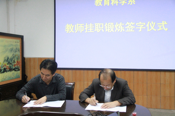 在签字仪式上,黄路阳强调,下派青年教师到小学、幼儿园挂职锻炼,要积极协助挂职单位做好教学和科研工作,并把小学和幼儿园对师范生的要求带回学校,提高教育科学系人才培养质量,培养符合小学和幼儿园要求的优秀教师。罗文谦分别对挂职单位和挂职教师提出希望和要求,要求挂职锻炼的教师紧抓这次锻炼学习的机遇,虚心学习,多了解基础教育,多深入实际,找准合作的切入点,为实现共赢发展做出积极努力。希望挂职单位要对挂职教师多做帮助和指导,并对其所做出的工作进行必要的考核和鉴定。两家挂职单位领导表示,对学院这一举措表示赞赏并全力支持,希望挂职教师能充分发挥自己的专业优势,贡献自己的聪明才智。挂职教师李支其、李鹏分别做了表态发言,表示不辜负院系领导的期望,珍惜挂职锻炼机会,虚心学习,在使自身综合素质得到不断提高的同时,为双方单位的发展做出积极地贡献。